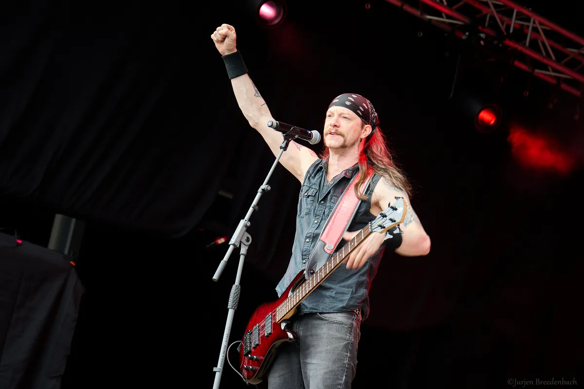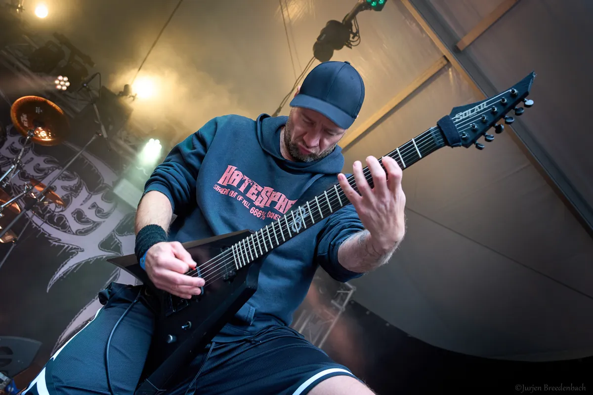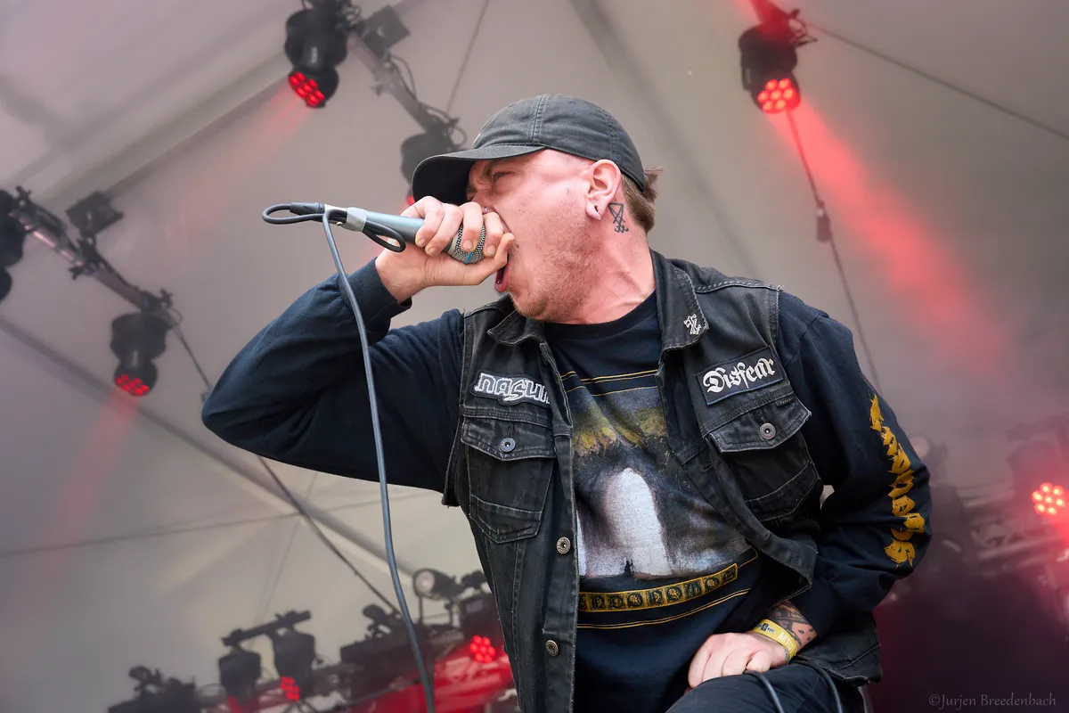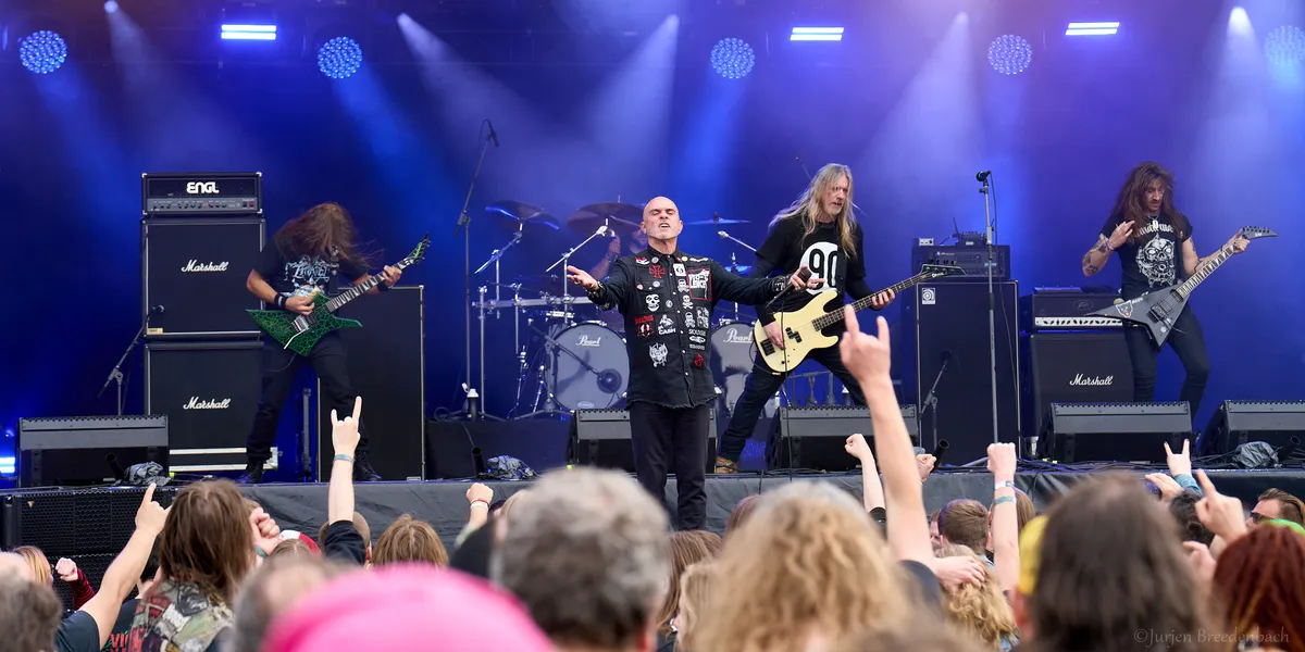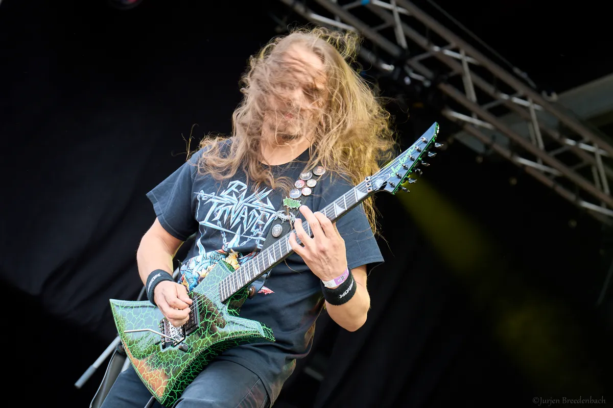 Het uit Los Angeles afkomstige Vio-lence heeft de volumeknop gevonden want de show is aanzienlijk veel luider dan de eerste act Arion. Wat direct opvalt is de bijzondere set-up van de drums, met maar liefst twee bass drums waar drummer Perry Strickland zijn handen de vernieling in slaat. De energie die van het podium afstuift laat het publiek eerst wat versuft achter. Het debuutalbum van de band kwam uit in 1988, dus ze gaan al even mee. Met hier en daar een hiatus is de band sinds 2019 weer samen en kwam hun plaat Let The World Burn uit. Vio-lence doet de naam eer aan, ze zetten vandaag een energieke en agressieve thrashshow neer waarbij er in het milde publiek zelfs een voorzichtige circle pit ontstaat tijdens het nummer Bodies on Bodies. Zanger Sean Killian weet de sociaal/politieke teksten nog altijd met passie over te brengen en laat een enthousiast publiek achter. (Sannette de Groes)