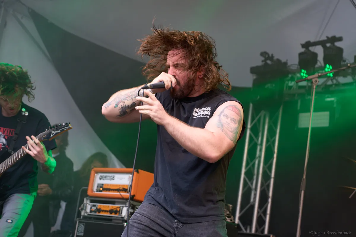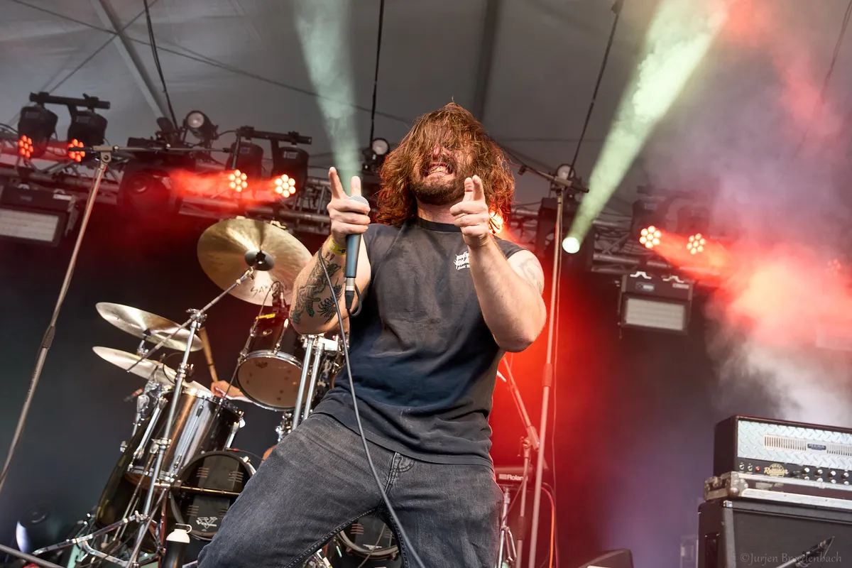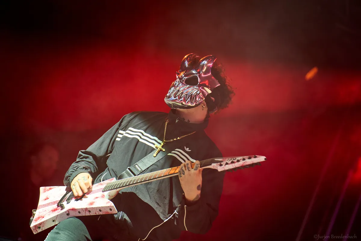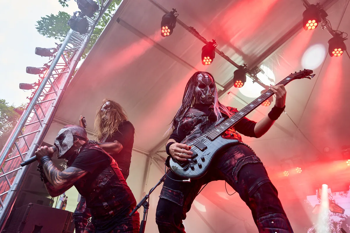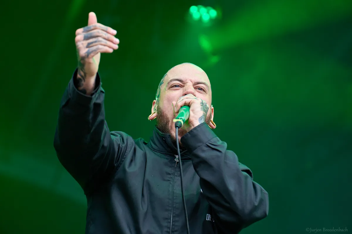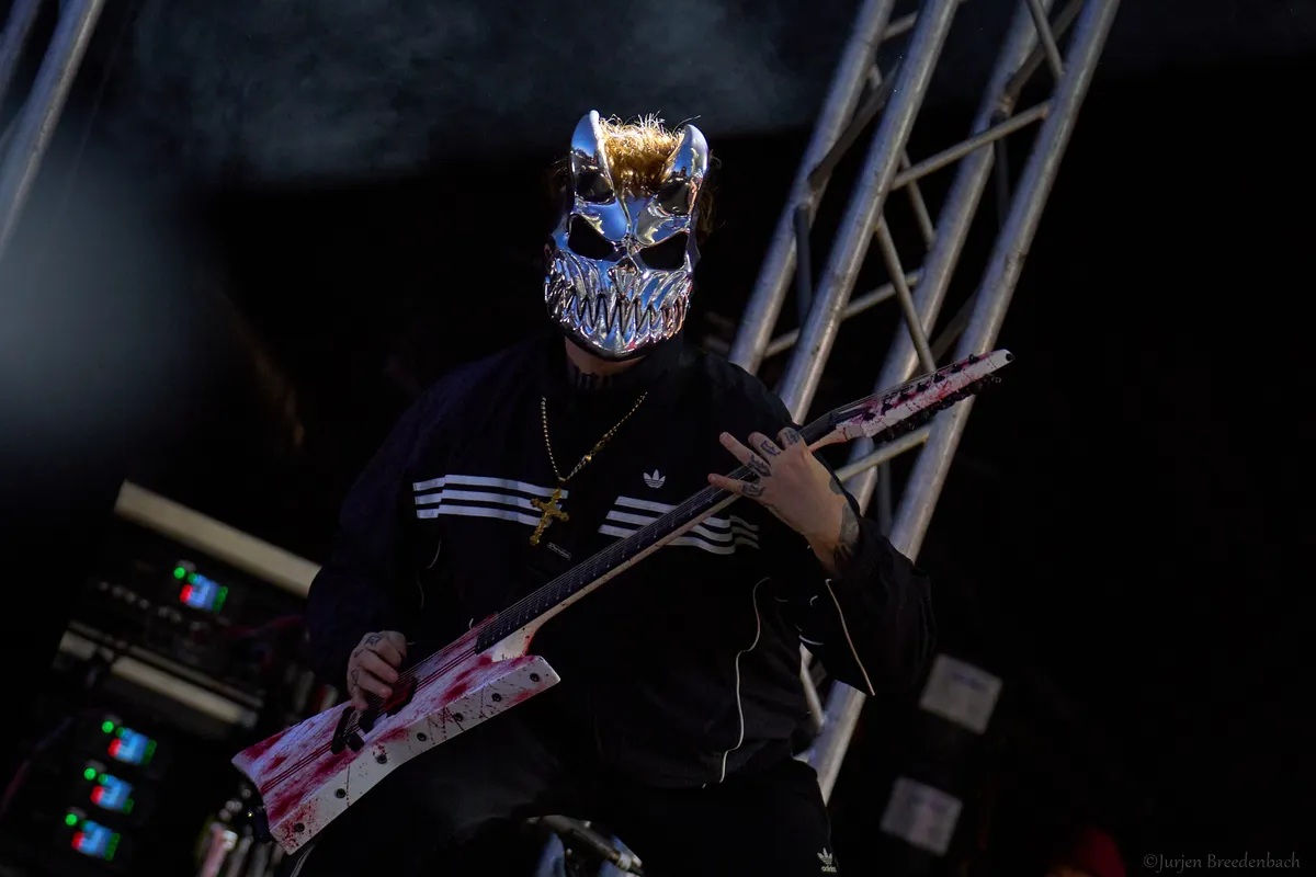 Een Gregoriaanse chant schalt dreigend over het Oldehoofsterkerkhof. Vijf mannen in monsterlijke maskers lopen onder luid gejuich het podium op. De maskers zijn bedacht door Alex Terrible, de frontman van de Russische deathcoregroep Slaughter To Prevail die we nu voor ons zien. Ze staan symbool voor de donkere kant die iedereen volgens de band in zich heeft. Hun donkere kant laat Slaughter To Prevail ons met veel bombast graag zien. Een show vol harde riffs, melodische momenten en slopende breakdowns met rookmachines die het podium aan het zicht onttrekken. Frontman Alex Terrible bewijst zichzelf als veelzijdig vocalist, hij zingt clean, harsh en op rappende wijze in zowel Russisch als Engels. Het is een omstreden man. Zo heeft het nummer 1984, wat ze vanavond ook spelen, veel kritiek opgeleverd uit zowel Oekraïne als Rusland en schijnt hij een extreemrechtse tattoo op zijn arm te hebben laten bedekken. Hij is de enige die tijdens het optreden zijn masker afzet, daarmee maakt hij zichzelf het focuspunt voor het publiek. Regelmatig spreekt hij de menigte toe met anti-Russische boodschappen en verhalen over hoe verandering bij jezelf begint. Dit zet hem weer in een ander daglicht, maar het publiek heeft er weinig oren naar en wil liever meer muziek horen om mee te schreeuwen. Gelukkig komen er nog een paar nummers die goed in de smaak vallen. Single Kid Of Darkness laat de grond beven, het hele terrein doet mee met de cover van Du Hast en tijdens de toegift zakt het volle plein naar de grond om synchroon op te springen en voor de laatste keer vandaag alle duisternis eruit te laten.