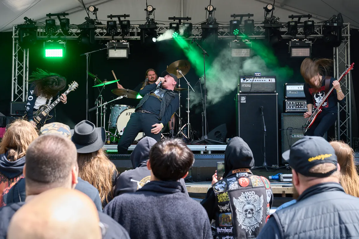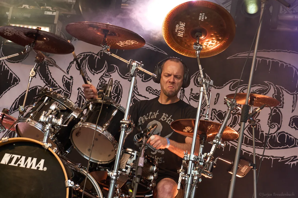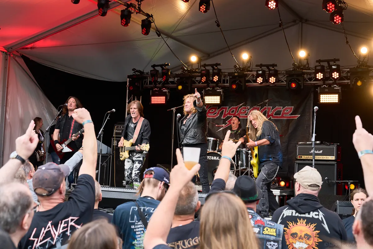 Naast alle death, doom en thrashmetal is er voor de afwisseling Vengeance. De zon breekt door wanneer Vengeance de set aftrapt met het nummer Take It Or Leave It. Deze heavy-metalband is opgericht in 1983 door Arjan Lucassen. Hoewel de samenstelling van de band door de jaren heen meerdere keren veranderd is, blijft de sound toch echt wel staan. Mensen genieten zichtbaar van energieke show die de heren vanavond neerzetten. De band heeft veel betekend voor de Nederlandse metal scene en ook vanavond staan de trouwe fans vooraan alles mee te zingen. De muziek doet sterk denken aan bands als Led Zeppelin, Deep Purple en AC/DC, maar Vengeance heeft toch wel een unieke sound gecreëerd. Tijdens de afsluiter Rock ’n Roll Shower gaat iedereen nog even helemaal los. Het publiek is goed opgewarmd voor de rest van de avond. (Sannette de Groes)