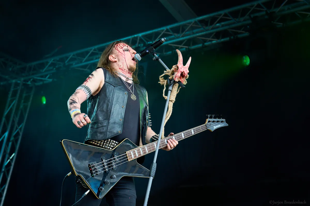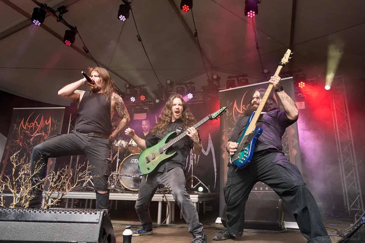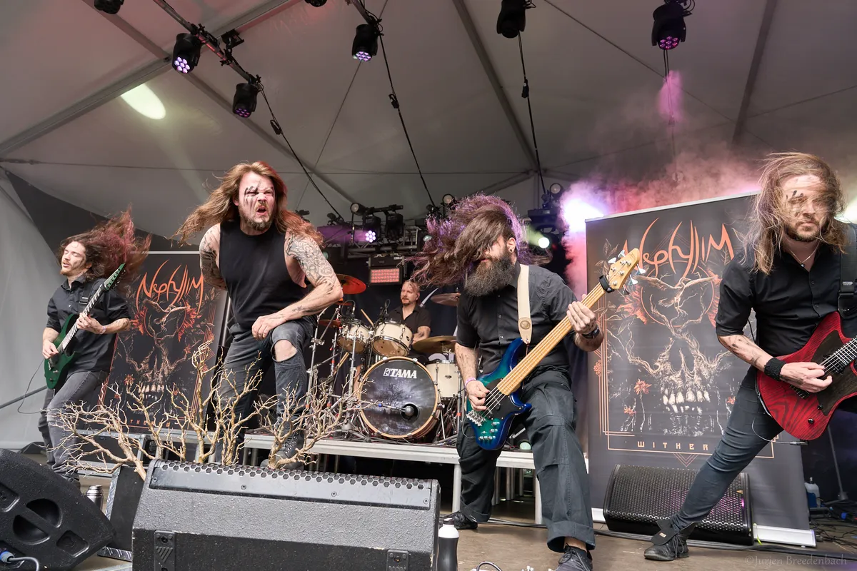 De eer om de Reaper Stage te openen is aan de melodische death metalband Nephylim. Vijf man sterk betreedt de Brabantse band het podium, vergezeld door een backing track vol strijkers die tijdens de set het zesde bandlid blijkt te zijn. Zoals het een echte death metalband betaamt, zijn hun gezichten beschilderd met zwarte strepen. Zoals het echte Brabanders betaamt, vragen ze het publiek: “gaan we er een feestje van maken?" Helaas voor het kwintet laat de gezelligheid nog even op zich wachten. Hoewel de band er vanaf het eerste moment vol voor gaat, is het publiek nog niet klaar om los te gaan. Een onsuccesvolle poging tot circle pit volgt. De aanhouder wint: De energie blijft hoog, de onderlinge interactie tussen de bandleden is aanstekelijk en langzaam maar zeker begint dit effect te krijgen op het publiek. Hoewel er nog steeds theekransjes gevoerd worden, verschijnen er ook steeds meer pits, horns en zelfs een wall of death aan het einde. Misschien leent de muziek zich niet voor een show op een zonnige vrijdagmiddag en was deze beter tot zijn recht gekomen op een later tijdstip of een donkerder hol. Aan de band heeft het niet gelegen, die heeft alles gegeven voor een energieke en overtuigende performance. (Tessa van der Veen)