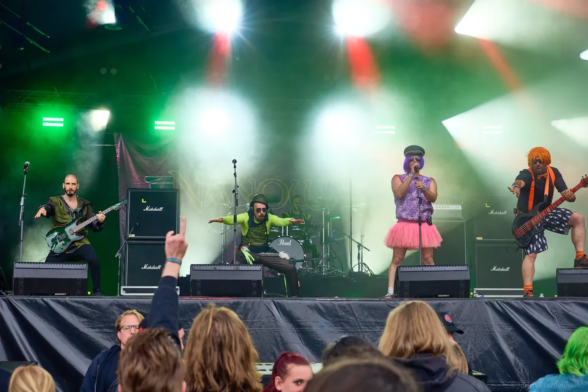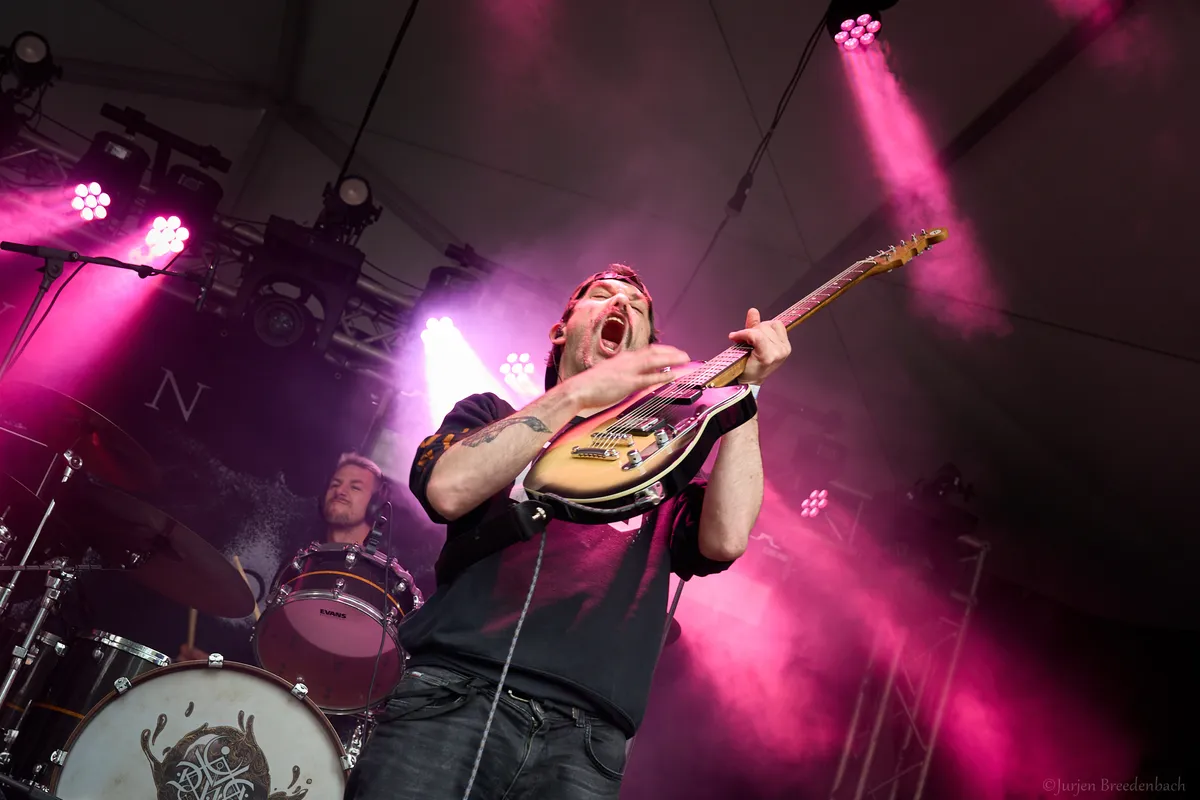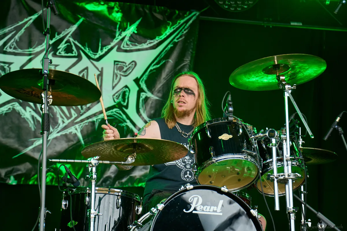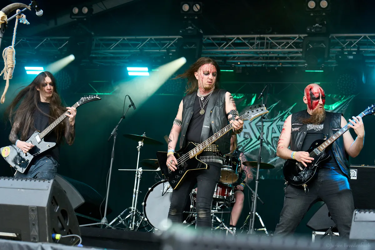 De eer om de Reaper Stage te openen is aan de melodische death metalband Nephylim. Vijf man sterk betreedt de Brabantse band het podium, vergezeld door een backing track vol strijkers die tijdens de set het zesde bandlid blijkt te zijn. Zoals het een echte death metalband betaamt, zijn hun gezichten beschilderd met zwarte strepen. Zoals het echte Brabanders betaamt, vragen ze het publiek: “gaan we er een feestje van maken?" Helaas voor het kwintet laat de gezelligheid nog even op zich wachten. Hoewel de band er vanaf het eerste moment vol voor gaat, is het publiek nog niet klaar om los te gaan. Een onsuccesvolle poging tot circle pit volgt. De aanhouder wint: De energie blijft hoog, de onderlinge interactie tussen de bandleden is aanstekelijk en langzaam maar zeker begint dit effect te krijgen op het publiek. Hoewel er nog steeds theekransjes gevoerd worden, verschijnen er ook steeds meer pits, horns en zelfs een wall of death aan het einde. Misschien leent de muziek zich niet voor een show op een zonnige vrijdagmiddag en was deze beter tot zijn recht gekomen op een later tijdstip of een donkerder hol. Aan de band heeft het niet gelegen, die heeft alles gegeven voor een energieke en overtuigende performance. (Tessa van der Veen)
