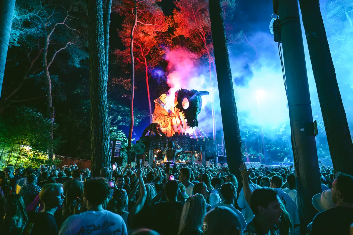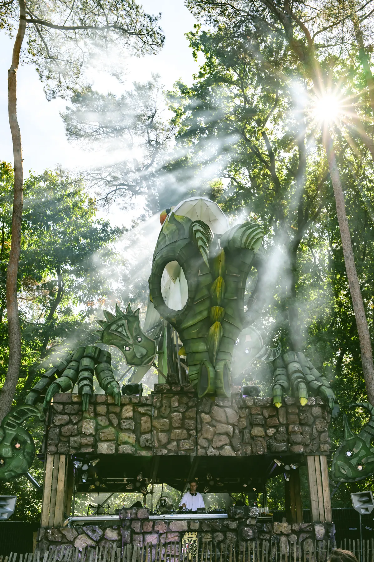 Een paar honderd bomen verder ligt de Takkenstage. Daar spreekt Fejká de taal van het bos. Of beter gezegd; helpt het bos spreken. Zijn kalme atmosferische ambient sluit naadloos aan op de omgeving. De melodische synths stromen door de bomen en de luisteraar zweeft er als een vlieger op mee. In zijn drie kwartier durende live-set komen veel van zijn grote platen langs. Handen worden geheven richting de meters grote gevleugelde kikker, die een drakenmasker draagt. Maar dan begint de maag te knorren, dus misschien is het tijd om even op een kritisch nootje te knabbelen.