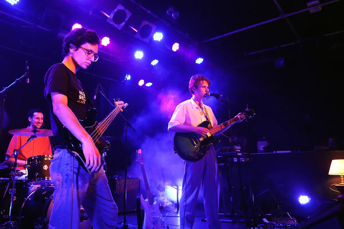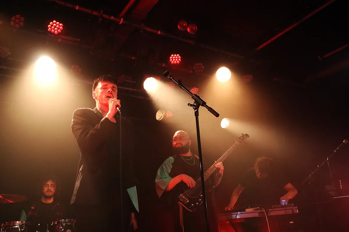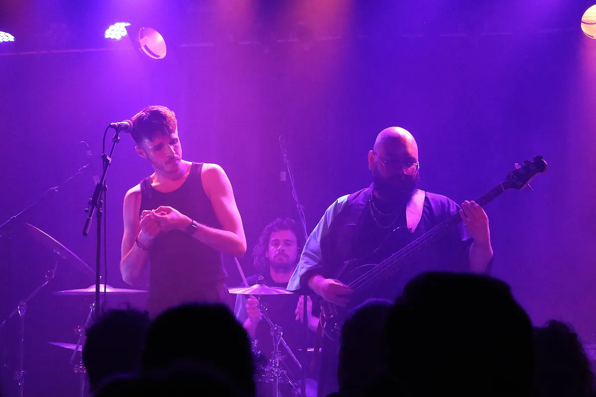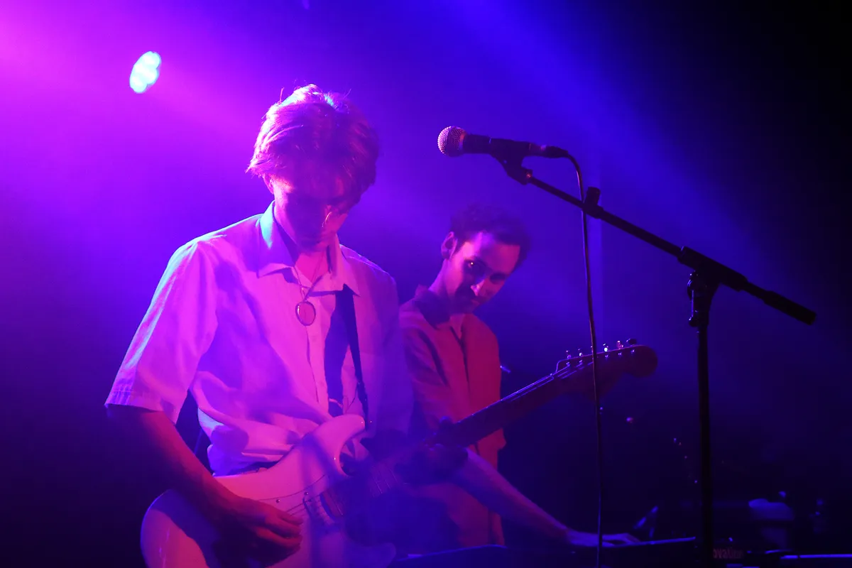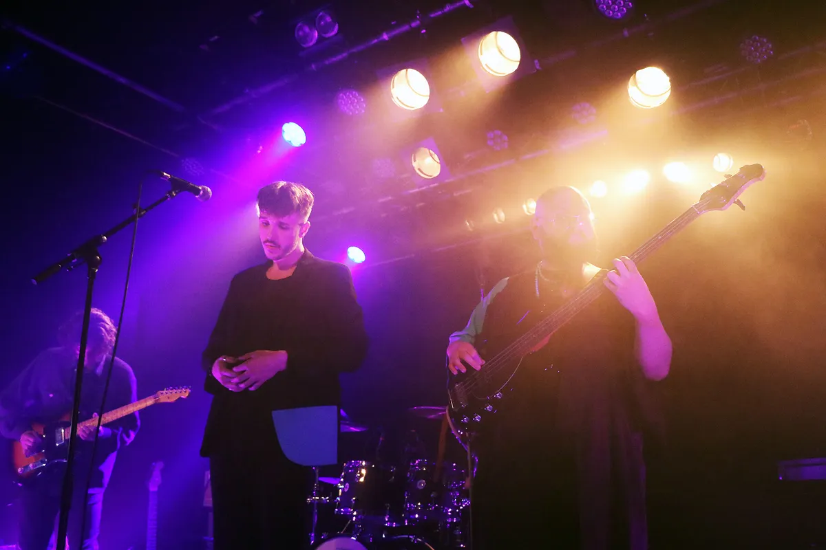 Maar het hoofdprogramma van deze avond draait om de Nijmeegse band IOK. Jeroen, Sander, Youri en Ramon presenteren hun nieuwe ep Being In The World, gekleed in het zwart met turquoise accenten. Vergeleken met hun roze overhemden, truien en kimono’s voor debuutplaat PINK (2022) een stuk zwaarder qua toon.