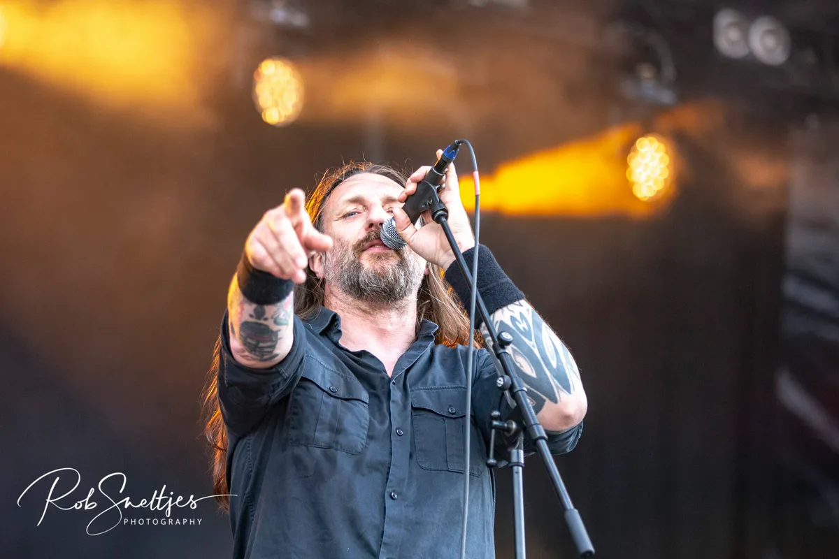 Als er een band is die het stonergenre in zijn totaliteit belichaamt, is het Orange Goblin. Een gedurfd statement wellicht, maar toch: hoe deze band bluesy jams, onvervalste rock-‘n-roll en zware metal ineen klapt tot een grote party, zorgt voor een totaalpakket die zelfs nonstoner fans naar binnen weet te trekken. Simpelweg de AC/DC of Motörhead van het genre: je weet elk album wat je kunt verwachten, maar verdomd als het live niet met veel plezier en aanstekelijk enthousiasme wordt gebracht. Dit uitgangspunt manifesteert zich al in de boomlange pretbek die Ben Ward heet, een frontman uit duizenden. Met een hoop mensen die nog bijkomen van sloopfeest Ingested, is het wel de vraag of Orange Goblin het publiek voor zich wint. Driewerf ja: wanneer de band het swingende Sons of Salem bereikt, gaat het los. Met de introducerende Sabbathriff van Saruman’s Wish kan er vervolgens weinig stuk. Het publiek geeft zich gewonnen, en wat volgt is een ijzersterke set die in de basis van stoner metal ook vele uitstapjes naar andere genres pakt. Van het pompende Made of Rats tot het thrashende intermezzo inclusief wall of death in They Come Back (Harvest of Skulls): een vlammende set in de brandende zon, bereidwillig opgeslokt. Boegbeeld Ben geeft dan ook aan hoe leuk hij het vindt in Nederland te zijn, omdat iedereen hier altijd goed dronken is. ‘’Even your fucking tower is drunk! Look at it, it’s completely pissed.’’ Tot slot komt er met Blue Snow, The Fog en Red Tide Rising een dikke pluim op een onvervalste metalfuif. Potverdorie hard! (MS)