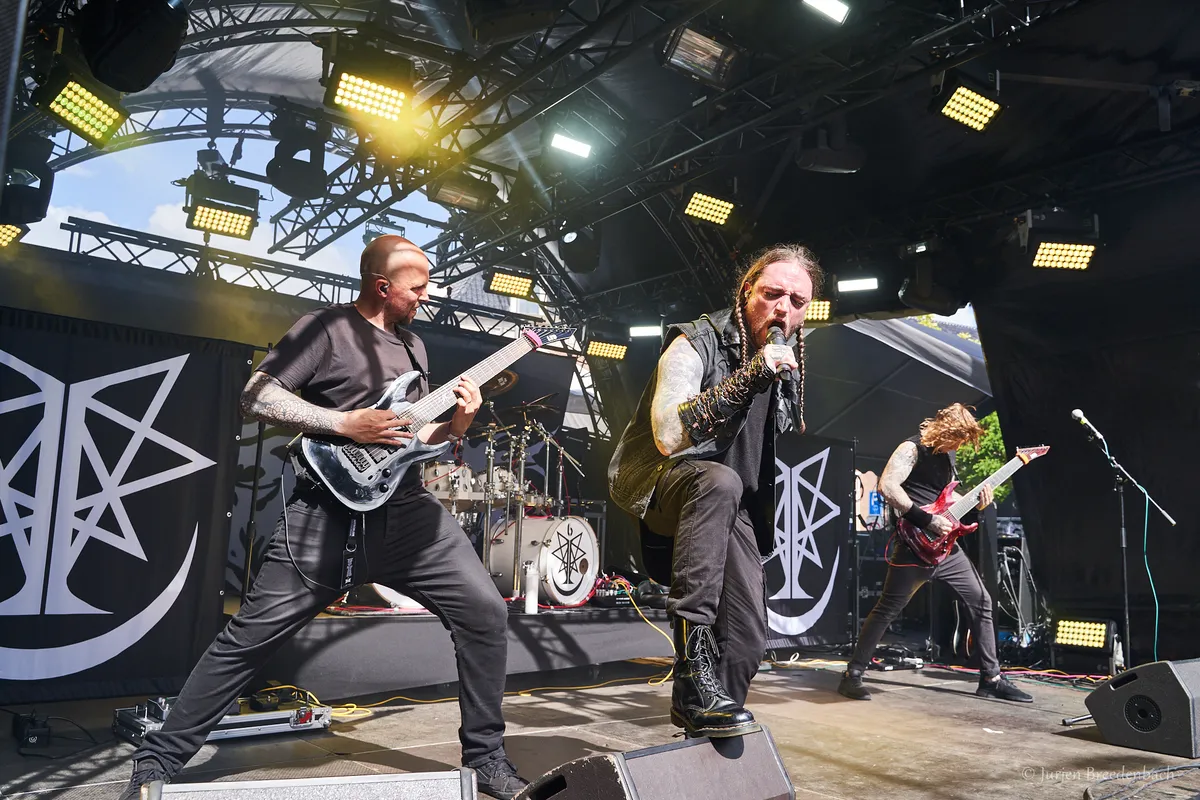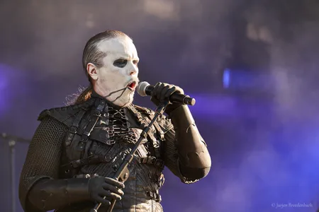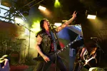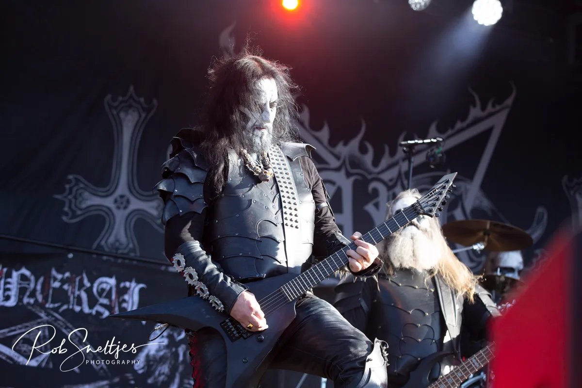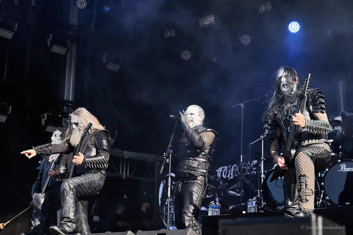 De ge-corpse painte Zweden laten het vandaag overvloedig aanwezige zonnetje voor in de avond nog een stukje nader zakken, met hun atmosferische, kille black metal. De Scandinaviërs lopen rond de helft van de jaren negentig goed vooraan in die tweede golf/lichting van met name de Noord-Europese black metalscene. Dark Funeral tuigt zijn satanische rites sfeervol op met fijn duister klinkende melodieën, verder aangezwengeld door de messcherpe blackreutels van zanger Heljarmadr. Oudje Open the Gates, van eerste wapenfeit Dark Funeral (EP, stammend uit alweer 1994), benadrukt bijvoorbeeld in dezen dat mooi donkere en duivelse sfeergoed. En het zijn niet alleen de typisch razende black metalratels die bij Dark Funeral voorbijtrekken. De band 'durft' gas terug te nemen en zijn sfeertekeningen nader uit te diepen met bezwerend rondspinnende gitaarlijnen. En ja, die prikkende riffs met melodieuze omranding, bovenop die hevig knuppelende drumtriggers – een minpuntje; die dreigen nu en dan in volume wat boven het gitaargeweld uit te komen – , geven een meevoerende weidsheid aan de nummers. Dark Funeral serveert een prima staaltje Scandinavische black metal, dat waarschijnlijk nog meer tot zijn recht was gekomen op een later tijdstip, met dus de donkerte erbij. (JdR)