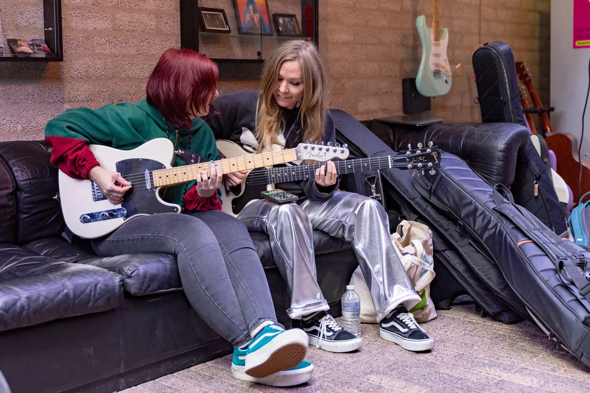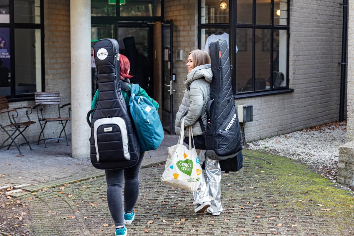 Er heerst een schoolreisjessfeer: grappen worden gemaakt, socials vergeleken en muziektips uitgewisseld. De band maakt kennis met Fugazi en de roadie met Paramore. Na een vrolijke discussie over waar powerpop eindigt (P!nk) en poppunk begint (blink-182), komen we aan bij de Wisseloordstudio’s: nu is het echt. Het wordt merkbaar stiller als we parkeren naast een bus waar met felle letters ‘Grote Prijs van Nederland’ op staat.