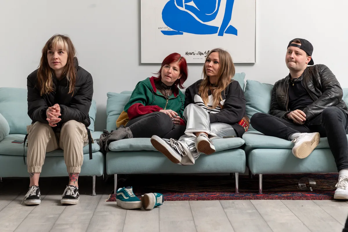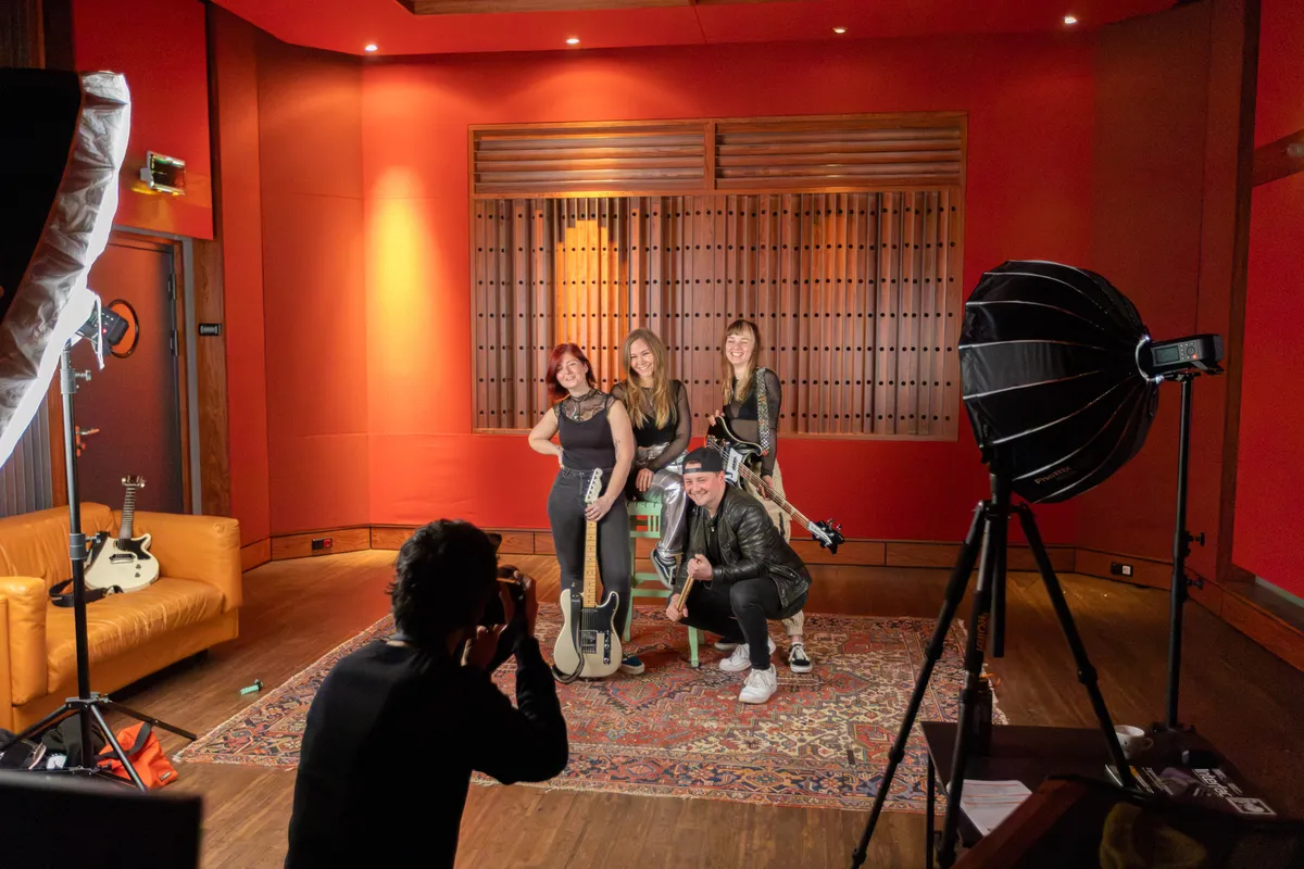 De fotoshoot! Zenuwen maken zich nu toch echt meester van de bandleden. Zenuwachtig gelach, een giechel en een drumroffel op Irina van Dylan. De fotograaf vuurt vragen af. Welke stijl? “Fun, energiek en een beetje wild!” Wel of niet op een bank? Een resolute afwijzing van alle bandleden. Met instrumenten? “Natuurlijk!” Maar, euh, Dylan heeft alleen drumstokjes. De fotograaf legt Dylan met een serieuze blik uit dat Dylan een drumstel moet uitbeelden zonder Irina als drumstel te gebruiken. Dus roffelt ie op Bianca.
