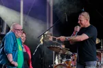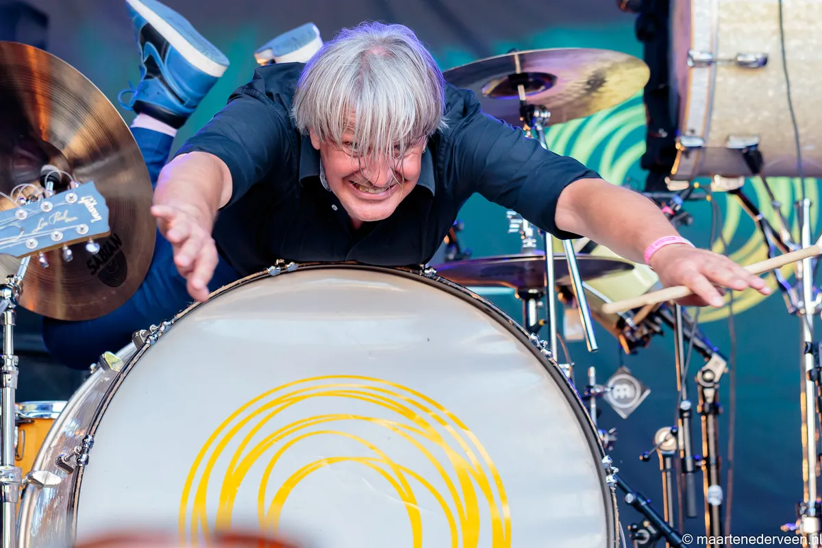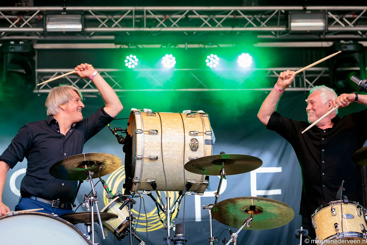 Later die middag doet Zuiderwijk met Sloper lekker zijn eigen ding. Dat houdt in: enorme drumsolo’s en samen met collega-drummer Mario Goossens (Triggerfinger) beuken op de gedeelde in de lucht zwevende extra basdrum. Earring-fans veren nog hoger op wanneer de fameuze Radar Love drumsolo verweven wordt in een andere solo. Want het gaat hier gewoon om de drumsolo’s; scherpe kijkers zien ook nog een zanger en gitarist stilletjes in een hoekje zitten.