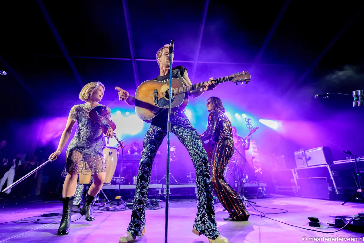De groep moest afgelopen donderdag nog een show afblazen omdat frontman Camiel Meiresonne geen stem meer had. Dat kan ook een verklaring zijn voor de tekstarme set van vandaag, waardoor vooral multi-instrumentalist Maud Akkermans flink aan de bak moet. Niet dat de frontman minder te doen heeft, hij vermaakt zichzelf - en vooruit, het publiek - prima met het rennen van de maracas via de toetsen naar percussie en weer terug. Tot slot wil de band ook nog kwijt dat er dit jaar geen optredens meer in Den Haag zullen zijn. Als je dat begin juni al weet, dan ben je een hele grote.