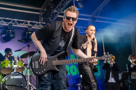 En dan is het tijd voor The Röyal Glit samen met The Horny Horns. Blaas of Glory maakte hardrockcovers uitgevoerd door een fanfare populair en metalcoverbands bestaan al sinds metal begon. Op het buitenpodium komen deze werelden samen. Want de synths in 'Jump' kunnen natuurlijk ook best door toeters worden gespeeld, om maar wat te noemen. Wat volgt is een set vol hardrockcovers, van Poison tot Guns 'n' Roses, die vakkundig worden uitgevoerd maar de knipoog missen die bands als Steel Panther en de Memphis Maniacs de nodige meerwaarde geven. Een bezoeker vraagt zich af of hij per ongeluk op een personeelsfeest is beland, maar stiekem is het ook best leuk om 'Unskinny Bop' weer eens te horen.