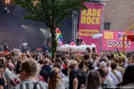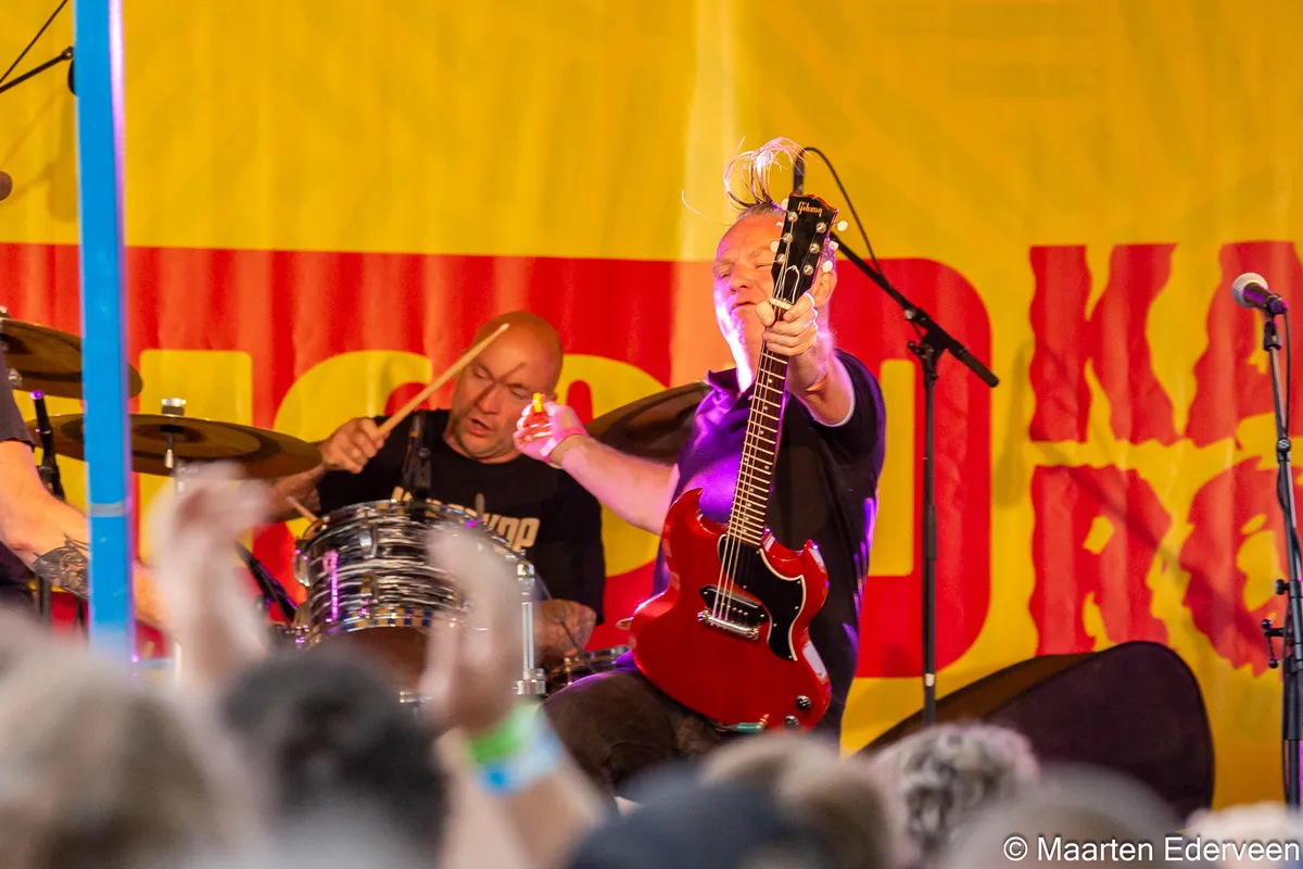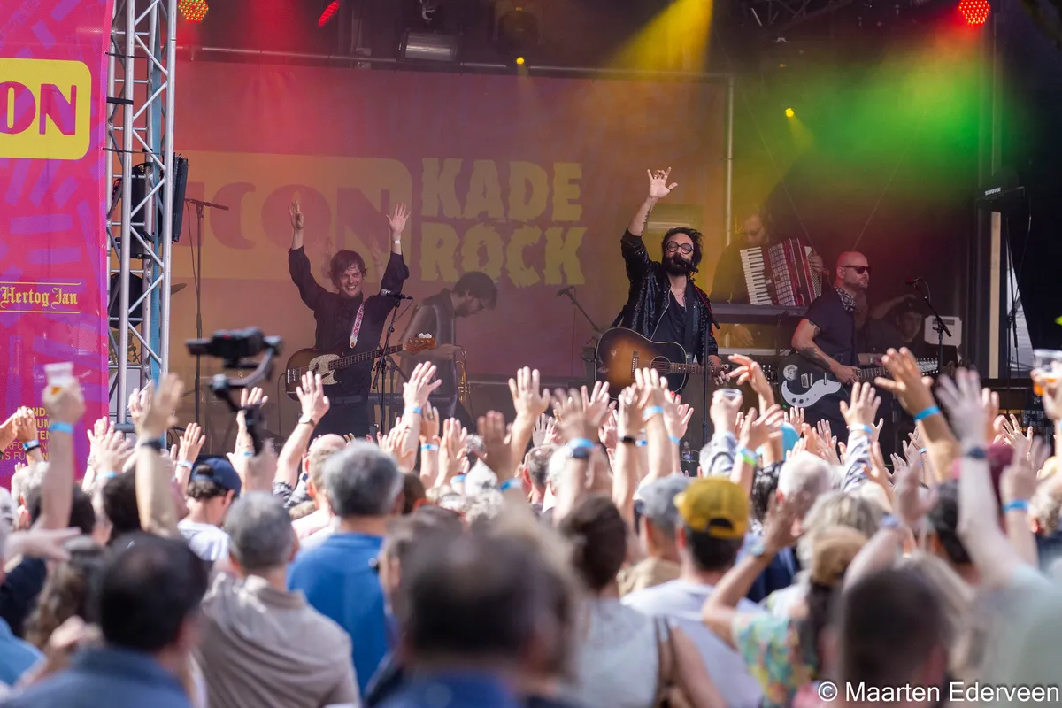 Het plein staat vol met alle leeftijden. Ook veel ouders met kinderen, op schouders aan de hand, met grote oorbescherming op. Ook veel oudere Musicon-rockers voor wie gehoorbescherming verspeelde moeite is. Prima vibe dus. Blaudzun komt op: applaus! Poeh, dat knalt dan best gelijk van het Plein podium. Ronkende stadionrock die aan The Waterboys en Son Mieux tegelijk doet denken. Het zit hem in de galm met bijpassende performance Waarmee ze zelfs de achterste rij zouden meenemen als die aan de andere kant van de kade zou staan. Een vol omarmend geluid met dito energie. De ronk zit al wel op de plaat, maar live gaat Bludzun er op en erover. Blaudzun heeft hier, vandaag, bij Kaderock, zijn depressie afgeschud. Als een coming out, maar dan out of the dark blaast hij into the light.