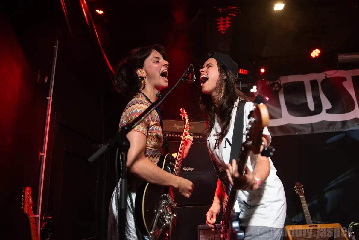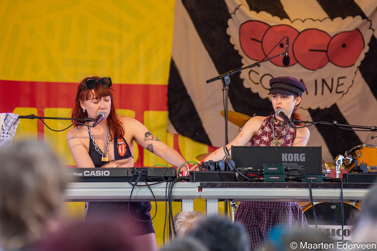 De nummers zijn zo nieuw dat ze, nog, geen naam hebben. De gitaar is weg en toch zijn deze beats een logische electro-techcore evolutie van nummers als ‘breastpump’ en ‘gilfcore’: sonische lappendekens met goede ronde en welgeplaatste beats, waardoor wordt heen gezongen zonder couplet of refrein. Denk aan nummers van de jonge Patti Smith en dito PJ Harvey die zinnen uitbrullen, of juist fluisteren, met dronende gitaar of bas. Vervang bas en gitaar met moderne mixtafels en electrobeats, en je hebt het idee.Tenminste, bij de laatste twee nummers gaat het plots vol op het gabberorgel, is er meer begin, midden en eind. Ondanks de goede beats, komt het publiek pas bij die laatste nummers goed los en dan vooral doordat zangeres Kate voor het eerste VOOR de mixtafels staat. Dat werk essentieel beter dan twee meiden, hoe enthousiast ook, die achter tafels staan. Er is een reden dat we dat frontvrouw noemen.