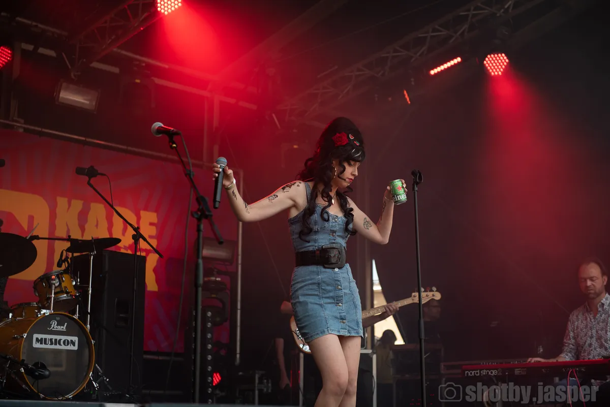 Zijn we bij de live performance van Amy Winehouse op het Glastonbury festival in 2008? Nee. We staan op Kaderock in Den Haag in het jaar 2024. Winehouse bracht slechts twee albums uit en werd wereldberoemd. Amy is niet meer, maar vandaag kruipt Denise van Dorst met haar tribute band Celebrating Amy in de huid van de jazz legende. Celebrating Amy geldt als dé Nederlandse Amy Winehouse tribute band. Met ‘Stronger than me’, ‘My tears dry on their own’ en ‘Just friends’ gaan we terug in de tijd. Amy wijdde deze emotionele nummers aan de liefde van haar leven Blake met wie de zangeres een tijd samen was. Denise van Dorst heeft lef. Om Winehouse te evenaren is veel nodig. De band gooit daarvoor alles in de strijd. De stem van Denise is niet alleen identiek, ook de algehele performance is moeilijk te onderscheiden van het origineel. Denise maakt een quasi verstrooide indruk en maakt opmerkingen over drank zoals: “This is definitely no water in my cup” en “Where is my beer, I am not kiddin”. Gek genoeg herinnert het de bezoeker er continu aan waarom we niet meer naar de echte Amy Winehouse kunnen luisteren. De jazz zangeres stierf aan een overdosis alcohol in 2011. Celebrating Amy heeft alles in zich om de originele sound van Amy voort te zetten. De rol van Amy is Denise op het lijf geschreven.
