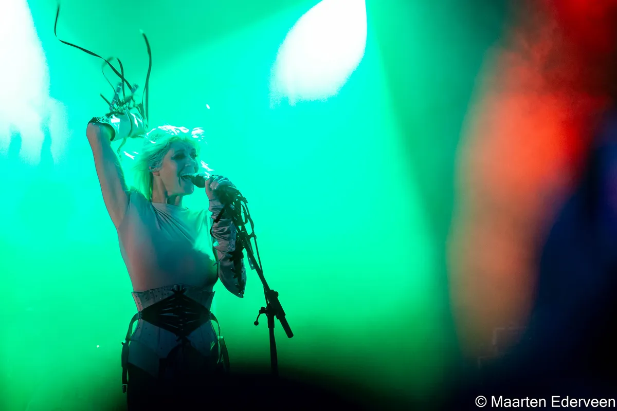 Als we, pijn als het ons als fans doet, heel eerlijk zijn, moeten we zeggen dat, behalve Winnie, de rest van de band wel wat aan hun podiumpresentie kan doen. Zo gauw je op een podium staat, wordt het show. Dat missen we vandaag een beetje. Tuurlijk leunt een song als ‘Canned air’ op een strakke diepe baspartij, maar om dan als zangeres halverwege door de knieën te gaan zitten met het hoofd gebogen; dat werkt niet echt lekker. Zeker niet als Winnie daarna laat zien dat je op 'Canned Air' ook uit je plaat kunt gaan door te stuiteren. Nou ja, de nummers zijn er niet minder om en als de band het ruigere 'Badlands' inzet, van een niet uitgebrachte cassette, is het gebrek aan nuance in de uitversterking niet meer storend. We genieten van wat we krijgen, nu we het eindelijk krijgen in Den Haag.