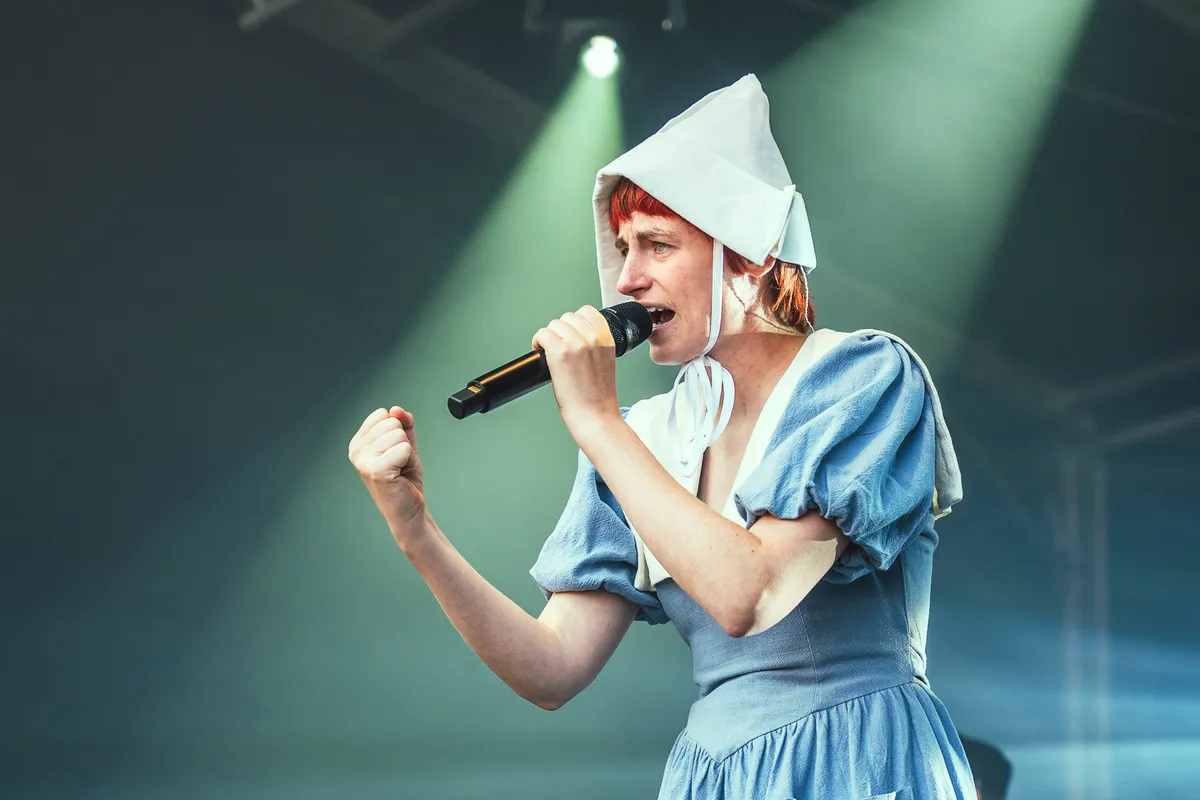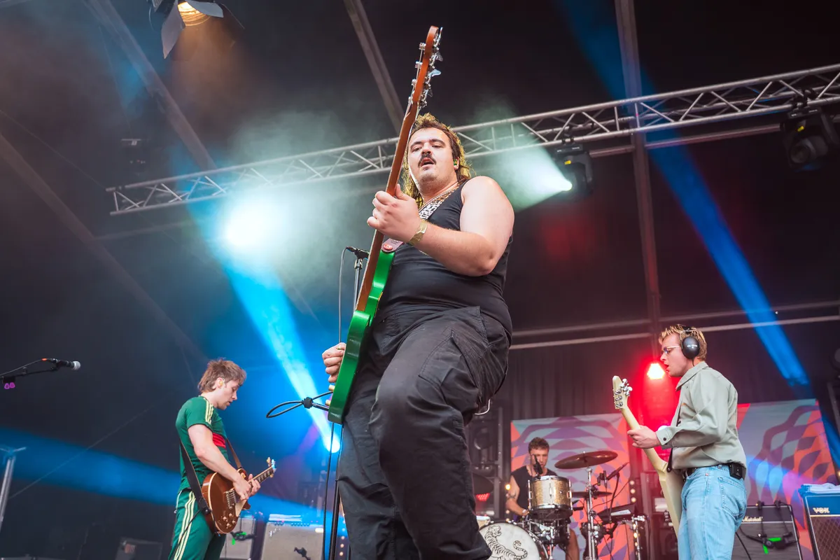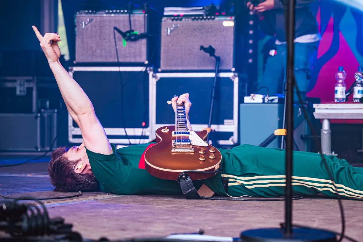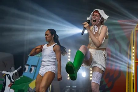 Tussen al dat gitaargeweld staat ook nog Elmer, zelfgekozen voornaamwoorden Haver/Gort. Elmer heeft een DIY-decor uit Amsterdam meegenomen waar de gemiddelde theaterdocent jaloers op is. Met een Oerhollandse molen, een draaiorgel en Elmer zelf in klederdracht gehuld, staat de show bijna volledig in het teken van album platland. Het optreden zit conceptueel en tekstueel sterk in elkaar, met gevatte taalspelingen en punchy Joost Klein-achtige beats. Ook de twee achtergronddanseressen/hype women hebben duidelijk zin in een feestje. Dat ze in baret en bretels het podium betreden, schrijven we maar toe aan het feit dat de Franse vlag ongeveer dezelfde kleuren heeft.