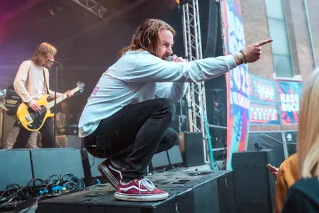 Als de avond valt op Kaderock, is het de beurt aan John Coffey om de boel af te breken — en dat doen de Utrechters zonder moeite. Zodra de eerste noten van 'STEAM WALTZ' klinken, spat de energie van het podium. De moshpit barst los nog voordat het refrein inzet. Het publiek reageert direct en massaal, alsof het collectief wakker schrikt uit een lange roes. Ondanks de afwezigheid van hun vaste drummer, staat de band als een huis. Mert van State Power neemt het drumstel over en doet dat met kracht en precisie. Zanger David springt en schreeuwt als vanouds, zoekt contact met het publiek en haalt de jonge bezoeker Nicholas het podium op. Die duikt meteen het publiek in voor een lange crowdsurf, gedragen door een zee van opgetogen handen. De band gooit er een paar verrassingen tussendoor, zoals 'No Cigar' van Millencolin en 'Breed' van Nirvana. 'Romans' wordt luid meegezongen, net als andere favorieten. De sfeer is uitgelaten, op het chaotische af. Den Haag is zelfs zo enthousiast dat een wall of death over moet omdat er te snel gemosht wordt. John Coffey bewijst opnieuw: deze band hoort thuis op het grootste podium.