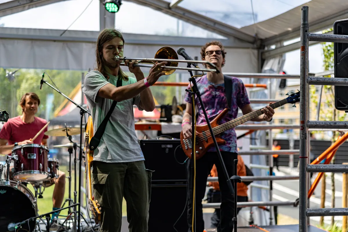 "Dat kaspodium" is de broeikas, dit jaar voor het eerst te vinden op Kaderock. De doorzichtige tent staat in het teken van muzikaal experiment en biedt daarnaast een podium aan meerdere (deels) Haagse acts. Zoals Flipperkast, dat hun afwisselende hardcore voor het eerst buiten ten gehore brengt, aldus de enthousiaste zanger. Het doet aan de energie in ieder geval niets af. Opvallend: we zien bassist Guus even later in dezelfde broeikas gitaar en trombone spelen én zingen bij U. De minst Googlebare band van het festival speelt een mix van ska en reggae die enorm doet denken aan Doe Maar, gelardeerd met wat Talking Heads. Het klinkt zomers, en een stuk beter aan te horen dan de paar gitaristen die na afloop om onverklaarbare redenen oorverdovende hoeveelheden feedback creëren.