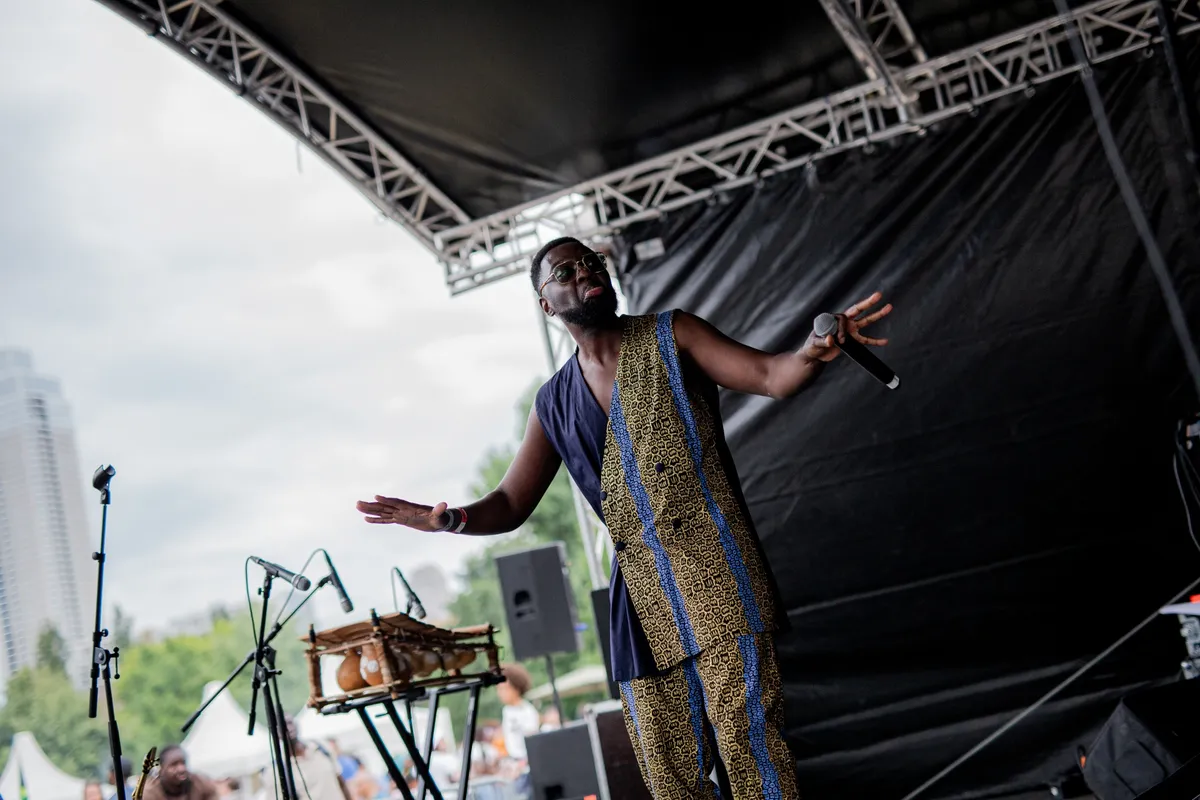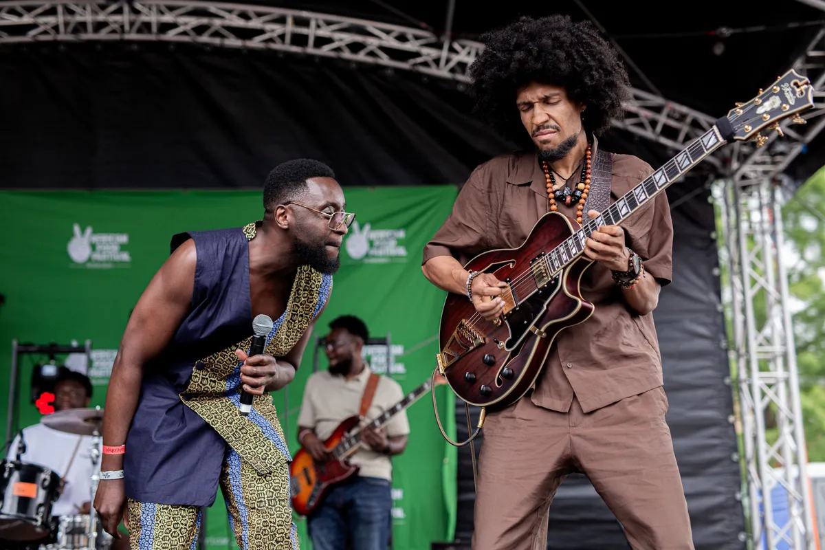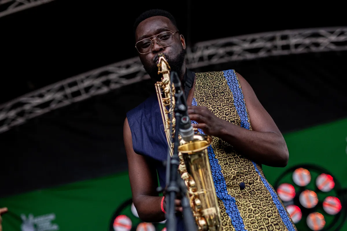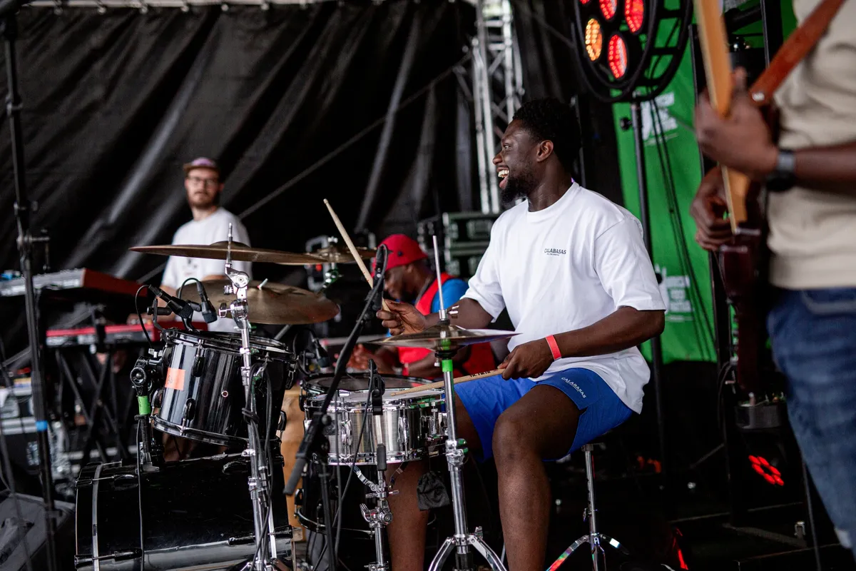 Op het Museumplein in Rotterdam hangt de geur van kruidige stoof tussen de puntdaken van de eettentjes. De sfeer is laidback: bezoekers strijken neer op het gras en de jongste generatie hangt aan de hekken. Wanneer Kay en zijn vijfkoppige band het podium betreden, schuifelt het publiek dichterbij. Zij worden getrakteerd op een uur durende set waar je je muzikale vingers bij aflikt. Kay is niet van plan het rustig op te bouwen. ‘We gotta take the highs out of the lows’, start hij, en nog voor het eerste nummer voorbij is, trekt hij iedereen zijn wereld in. Door zijn vlijmscherpe rap, de funky akkoorden van toetsenist Anton, trombonist Lezaam met snelle, speelse frases en Noam’s gelaagde gitaarwerk begin je vanzelf te bewegen, zelfs als je nog met een bord jollof op schoot zit.