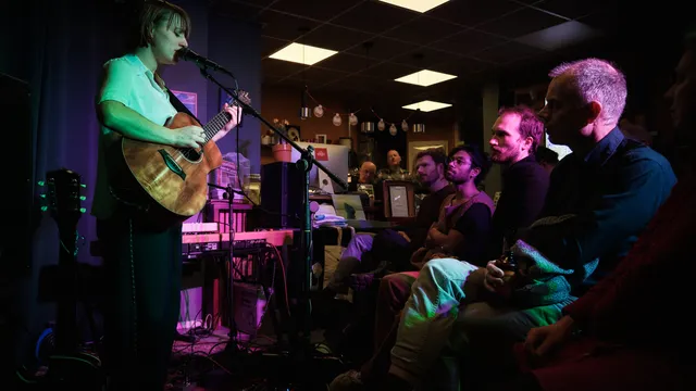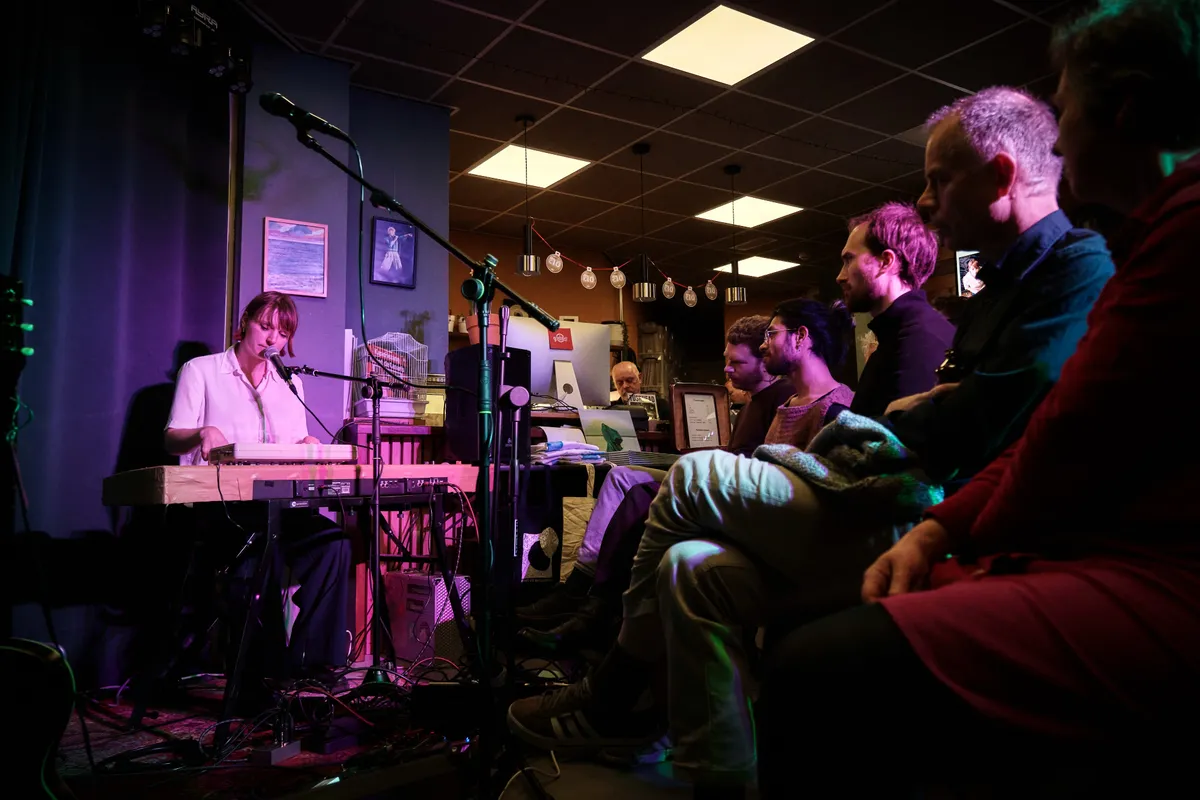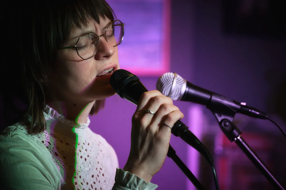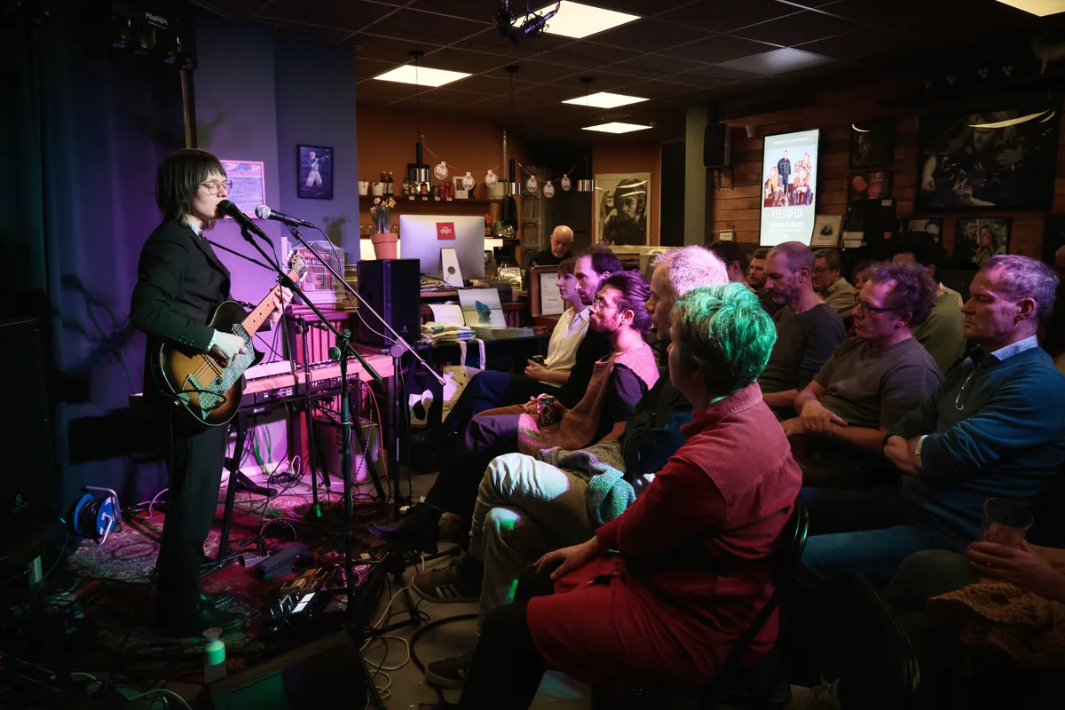 Sophia Keck aka fuis dus – Find Me In Slumberland als we nog verder terug gaan – bijt het spits af. Op het recent verschenen album Here's to Asking for Help hoor je mysterieus bezwerende rocksongs en een scheut electronic. Maar vergeet dat: vanavond horen we Keck open over haar emoties, kaal en rauw qua muzikale sfeerzetting. “Ik vind dit best wel eng”, geeft ze breekbaar toe. Om hier mijn eigen ervaring te delen switch ik even naar de ik-vorm — eng is het inderdaad: ik kom hier elke week en De Groeverij is een vertrouwde en veilig voelende plek, maar vanavond wil het niet. Iedereen praat te hard, we zitten dicht op elkaar en de concentratie ontbreekt. Eng? Ja!