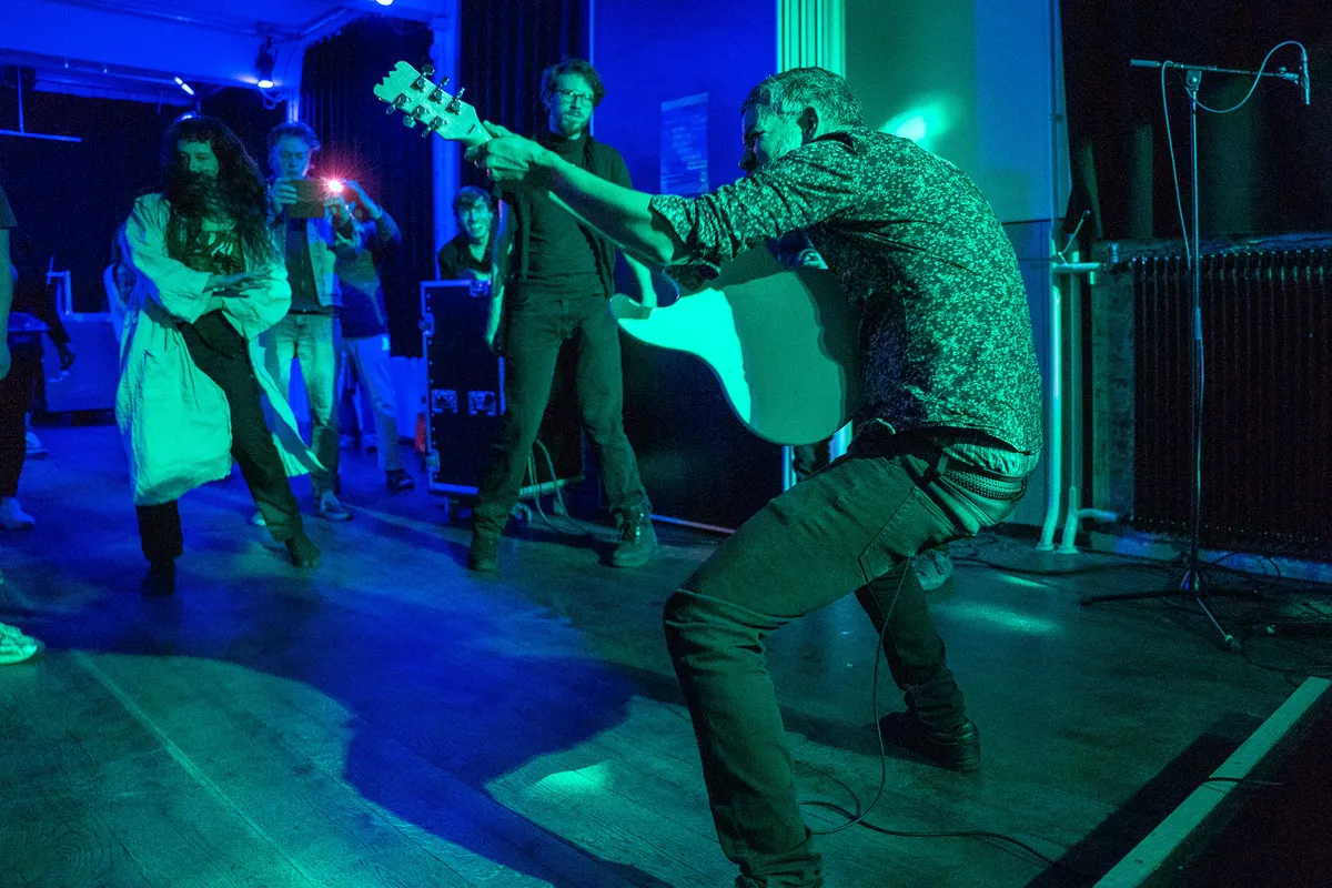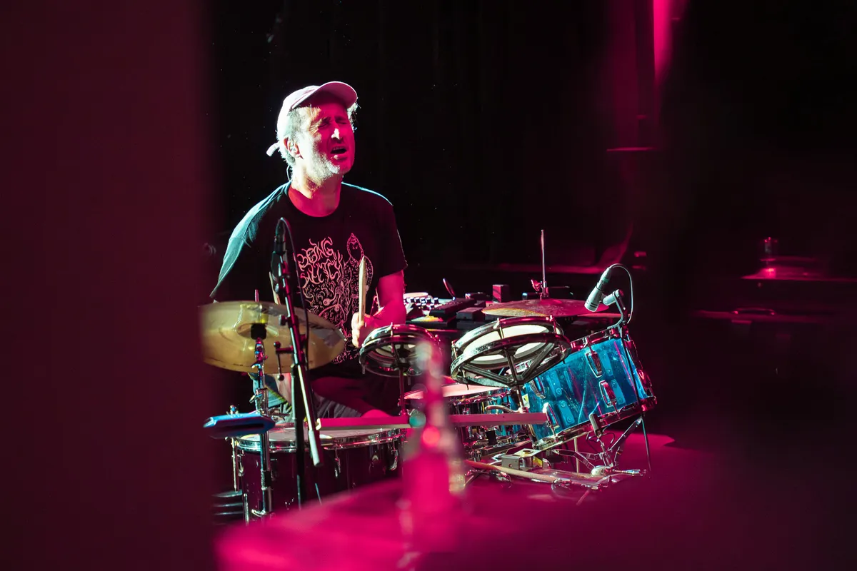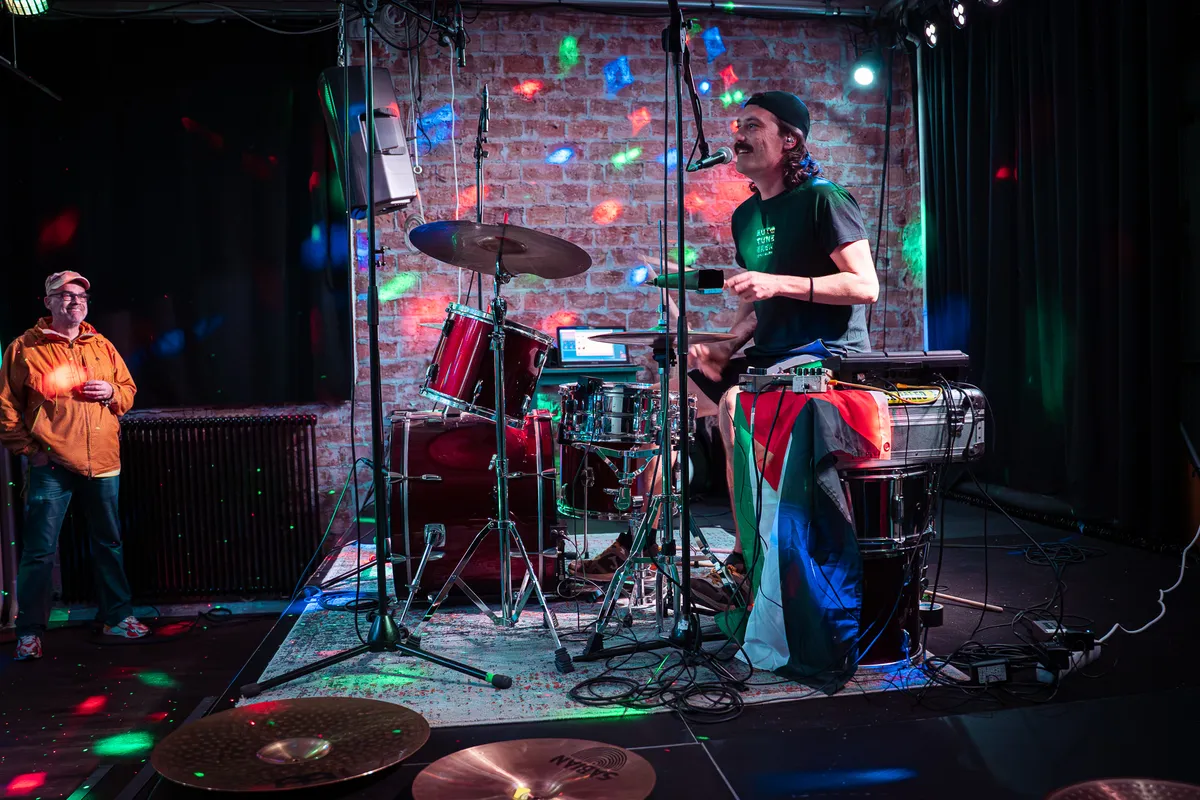 Naar het einde toe voegt zich plotseling een drummer uit het publiek toe, trommelend op vloer en radiator, en eindigt uiteindelijk achter het drumstel op het podium. Het blijkt de Catalaanse muzikant Edi Pou te zijn, die daarmee de tweede act van de avond inluidt.
