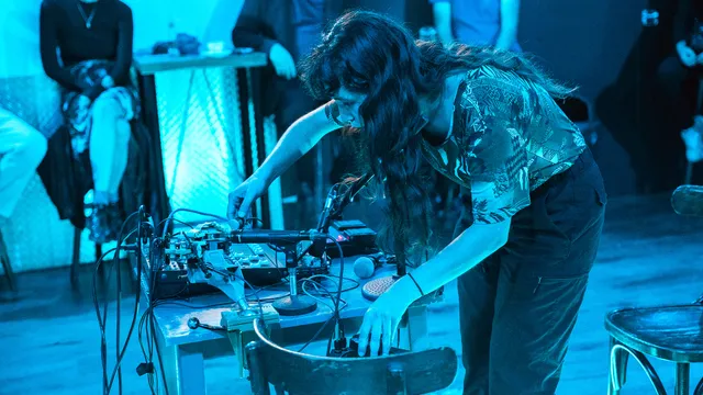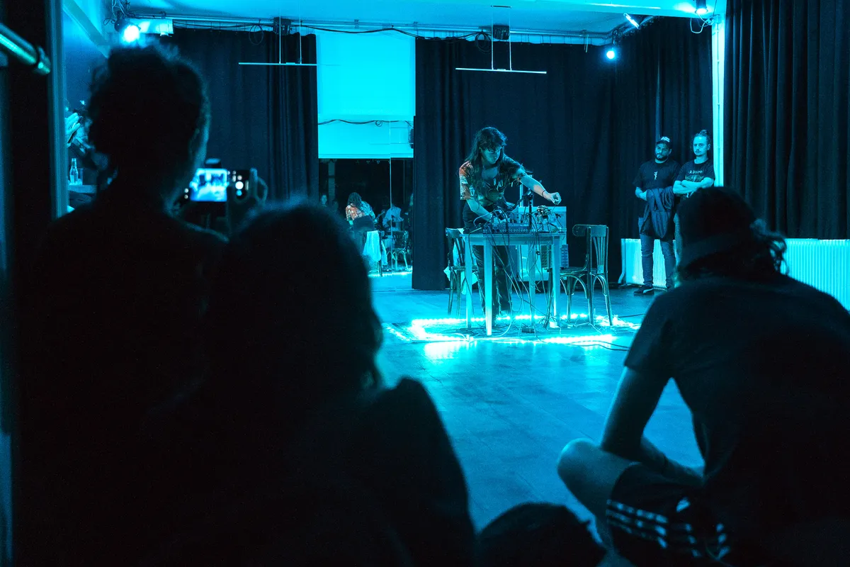 Bij binnenkomst trekt het grote podium met drumstel meteen de aandacht, maar de eerste act blijkt zich midden in de zaal te bevinden. Achter een houten tafel vol panelen en mysterieuze objecten creëert de Servische geluidskunstenaar Katarina Kadijević een dromerige en abstracte soundscape. Met knoppen en schakelaars bouwt ze haar set op, af en toe aangevuld met bijna dierlijke stemklanken. Het publiek, zittend in kleermakerszit, volgt de performance aandachtig.