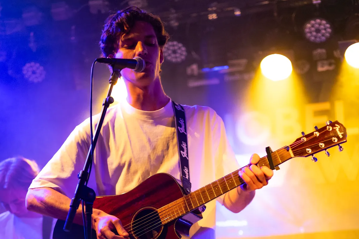 Na een welkomstwoord van vaste presentator Ernst, schuifelen Guus Hemmes en zijn band als eerste act van de avond voorzichtig het podium op. Het is altijd net even spannender om de avond te openen, maar van eventuele zenuwen valt weinig te merken in de zang van Guus. De bijzonder aangename stem van de Leidse singer-songwriter is vanaf de eerste noten van ‘Parallel’ hartstikke zuiver, en in combinatie met zijn charmante uitstraling is het niet verwonderlijk dat er al een plukje jonge fans aanwezig is in de Qbus. Guus is zich ook bewust van zijn zoetgevooisdheid: "Misschien waren deze eerste twee liedjes een beetje zwijmelnummers, maar we kunnen meer dan dat, hoor!”, gevolgd door ‘New You’, wat eigenlijk net hetzelfde zwijmelgehalte heeft.