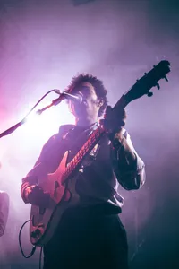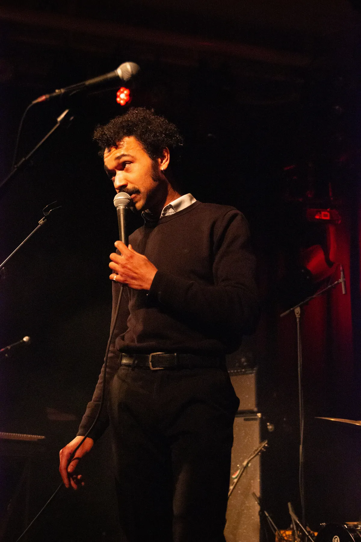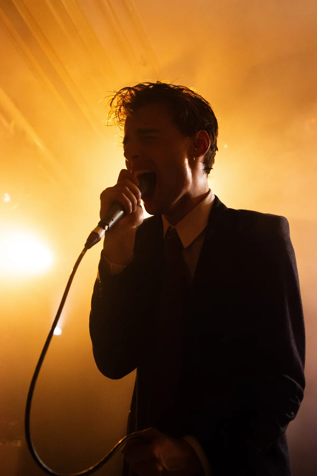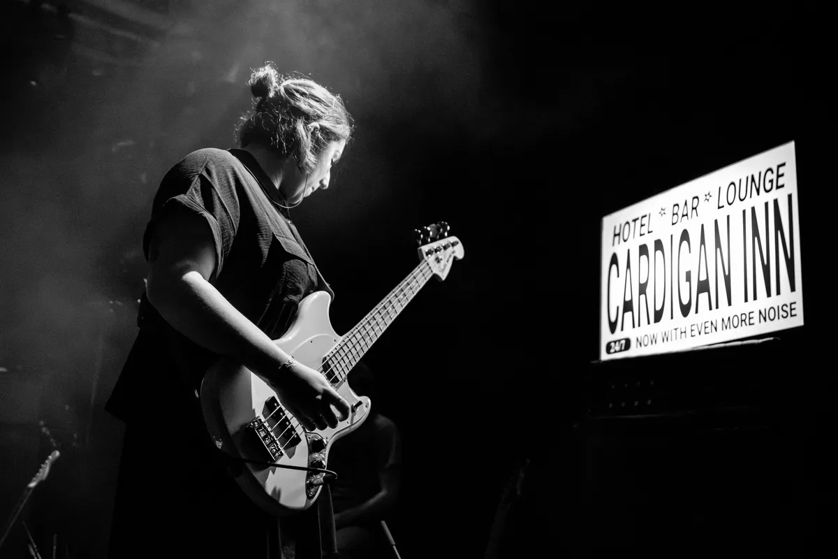 Langzamerhand vult het podium zich met volle formatie, en vanaf dat moment is het raak. Joe Pilmeijer en Sidney Francis laten hun gitaren schitteren, terwjl bassist Mariam Rumora en drummer Igor Jongenelis een stevige ritmische basis neerzetten. Pulserende synthesizers en onweerstaanbare melodieën vullen de ruimte, maar het is Pablo Nollet die met zijn donkere vocalen de aandacht grijpt en niet meer loslaat. Dit blindelings vertrouwen, ontstaan door uren oefenen tijdens de Popronde, voelt moeiteloos. Vanzelfsprekend slaagt deze groep erin om genres te verbinden tot een eigen, samenhangend geluid. Met de danspasjes van frontman Pablo Nollet is het geen wonder dat Cardigan Inn binnen de eerste vijf minuten alle voetjes in de zaal van de vloer weet te krijgen.