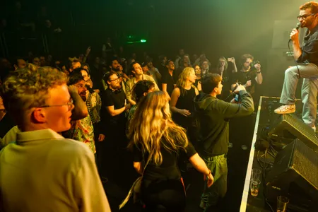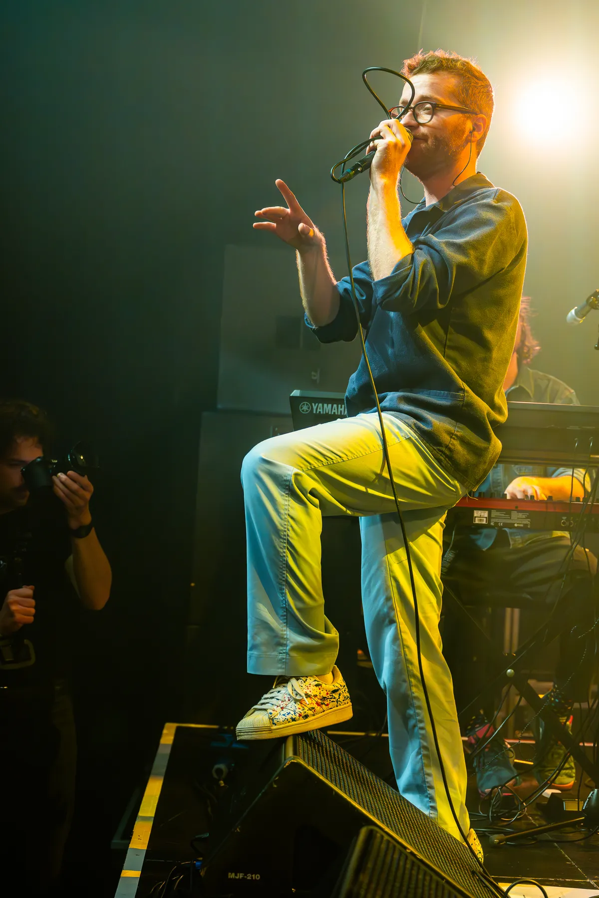 Voor de ballade Summer In Amsterdam komt de voltallige band weer het podium op, met een mooie feature voor de blazerssectie en een prima gitaarsolo, die helaas achterin de zaal niet goed hoorbaar is. Op uitnodiging van Laniek deint het publiek volop mee van links naar rechts en wordt het ‘laaidiedaai’ gedeelte uit volle borst meegezongen. Het ziet eruit alsof de band nu pas echt lekker warmgedraaid is: zelfs die ene toetsenist en die ene backingvocalist die tot nu toe schijnbaar verveeld op het podium staan, komen los bij Show Don’t Tell. Dat La Nique zichzelf presenteert als vertolkers van met name folk, is hierna écht even ver te zoeken. Met het rock ’n roll deuntje Excusez-Moi, gevolgd door de dixieland van Nico Haaks Foxy Foxtrot lijkt het alsof de Melkweg het decor is geworden van een fout bruiloftsfeest met op het podium een tienkoppig showorkest. Het publiek vindt het echter prachtig en host en danst stevig mee.