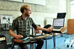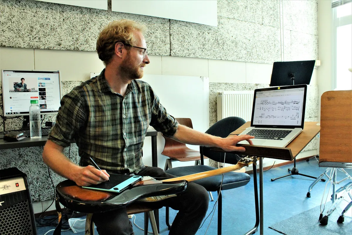Max is zich er sterk van bewust dat leerlingen voor hun plezier naar basles komen, en doet dan ook niet moeilijk als iemand een keer niet heeft kunnen studeren. “Als docent moet je je goed kunnen verplaatsen in iemand. Echt wel een beetje voelsprieten hebben voor hoe iemand in elkaar zit en daarin mee kunnen gaan. Ik vind het ook belangrijk om in te spelen op iemands belevingswereld. Daarom probeer ik de inhoud van de lessen op te hangen aan muziek die iemand leuk vindt. Dus ik behandel een bepaald nummer of een bepaalde stijl, maar dan zo dat je er technisch of theoretisch allerlei overkoepelende zaken uit kunt halen. Ik denk dat ik misschien meer dan de gemiddelde leraar op de theorie zit, voor een wat steviger begrip van hoe muziek nou eigenlijk in elkaar zit. Omdat je dat breder kunt toepassen dan ‘dit of dat vakje op de hals’. ”Ook vindt hij het leuk om iemands muzikale horizon te verbreden: “Als ik iets in m’n computer heb waarvan ik denk dat het kan aansluiten bij de muzieksmaak van een leerling, probeer ik dat aan te bieden en dan kan het zomaar dat diegene daardoor nieuwe bands ontdekt. Dat is ook iets tofs om mee te geven.” Max maakt al zijn lesmateriaal zelf en is sinds dit muziekschooljaar volledig overgestapt op lesgeven met de laptop. “Fantastisch! Echt een van de beste zetten die ik de afgelopen jaren heb gedaan. Ik ontwerp alle oefeningen min of meer custom, zodat ik er van alles uit kan halen. Die heb ik nu allemaal altijd bij me in m’n laptop en als ik iets moet aanpassen, bijvoorbeeld een nummer in een andere toonsoort zetten, dan gaat dat veel sneller dan vroeger. Bovendien ziet het er veel netter uit dan toen ik alles met de hand uitschreef.”
