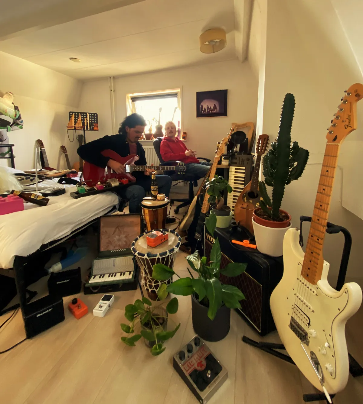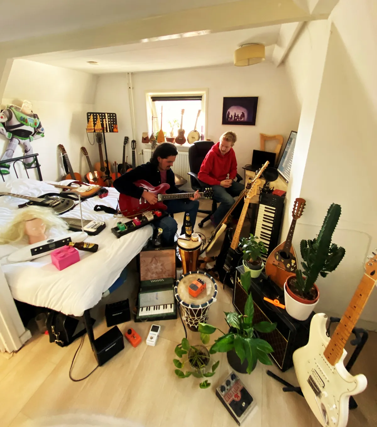 Bas Aarnink en Stijn Roos van Raadshooven kennen elkaar van de popacademie in Utrecht, waar de twee gitaristen/producers blijkbaar zo’n goede klik hadden dat ze ondertussen samen een woning hebben betrokken in Leiden. De creatieve samenwerking van het duo begint doorgaans bij een idee van Bas, waarna Stijn een bijpassend stuk of een instrumentale partij verzint. Vervolgens duikt Bas zijn slaapkamer in, waar hij met deze materialen aan de slag gaat. In zijn creatieve cocon werkt Bas dagenlang aan de productie en neemt hij talloze partijen op met behulp van een breed scala aan samples en instrumenten (kijk maar eens goed naar de albumhoes, of de foto hierboven). Na lang broeden ontpopt zich dan uiteindelijk een bontgekleurde vlinder, en in dit geval fladdert ‘Introspection’ nu de wijde wereld in.
