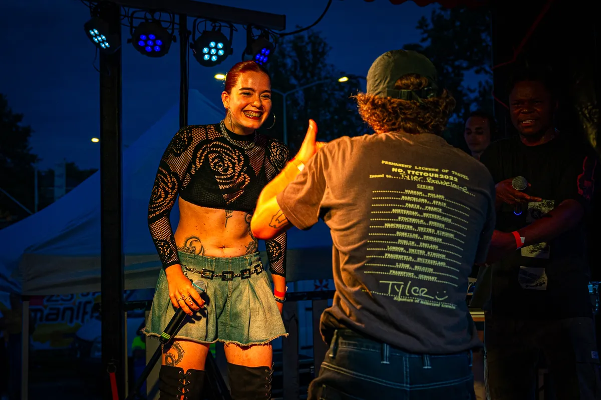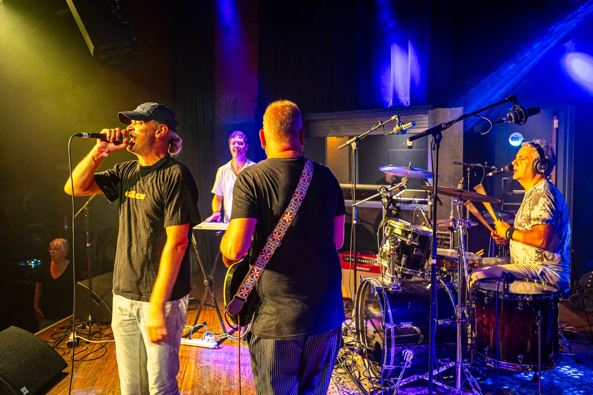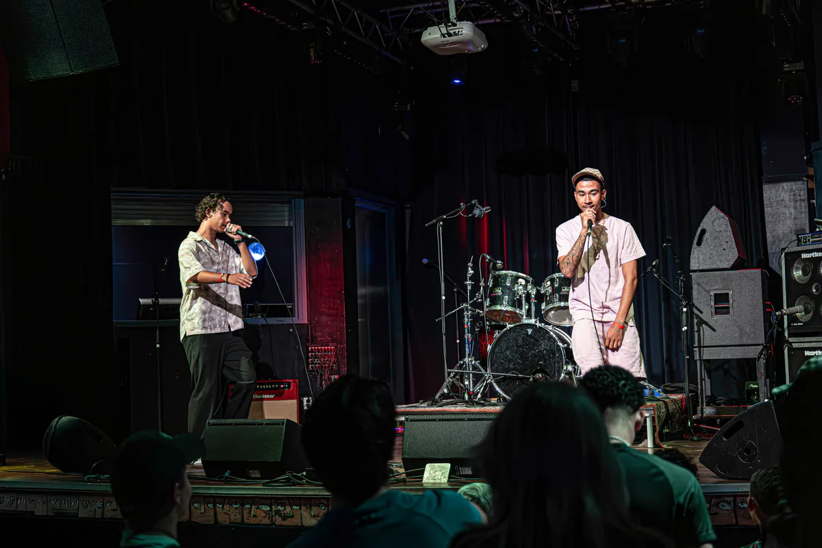 Aanstekelijke energieHet Hoornse collectief Wallplug beweegt zich vrij tussen disciplines als kleding, kunst en (hiphop)muziek. Met hun aanstekelijke energie en enthousiasme weten ze een feestje van ieder optreden te maken en ook vanavond hebben ze er duidelijk lol in met z’n vijven. De show loopt soepeltjes, de rappers pakken op een organische manier om beurten hun plek on the stage en zijn prima te verstaan: soms in het Nederlands, soms in het Engels, maar altijd met overtuiging – ze beleven hun tekst. Dat geldt ook voor de fraaie zanglijnen van de flamboyante Tessa Rose, die het collectief in 2022 uitgerekend in Manifesto ontmoet, zo vertellen ze tussen twee nummers door. Uiteraard wordt ook het eerste album nog even gepromoot (‘Check die!’) en het ep’tje dat ze drie weken geleden droppen. Verder is het vooral veel ‘hands up’, waaraan het publiek enthousiast meedoet en na een spontane toegift kan Wallplug terugkijken op een geslaagd optreden waarbij het collectief een mooi visitekaartje heeft afgegeven bij de niet-hiphoppers in het publiek.