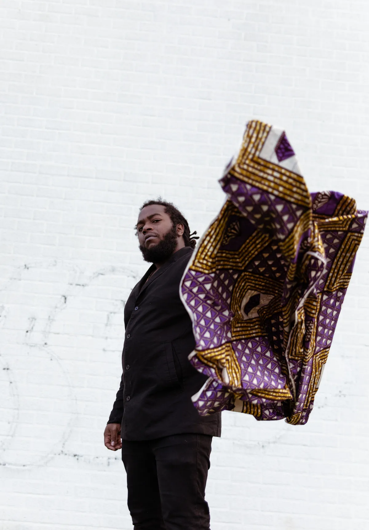 “Het kleed komt uit Suriname, dat heb ik van mijn tante uit Suriname gekregen. De chest hierin is het trots zijn op waar ik vandaan kom, op mijn eigen cultuur. Ik ben in Amsterdam geboren, maar mijn ouders komen uit Suriname dus veel familieleden zijn daar geboren. Vroeger heb ik vaak een verkaast gevoel gehad. Ze zeggen: ‘je bent verkaast, je bent van hier’, je weet toch? Op gegeven moment begon ik me te beseffen: dat maakt helemaal niet uit! Waar je vandaan komt, wil niet zeggen waar je eindigt! En, toen ik in 2019 in Suriname was heeft mijn tante mij dit kleed gegeven. Of, eigenlijk is het geen kleed; het is een stuk stof. Je bindt het om je middel als een pangi.” MC Lost laat me ondertussen zien hoe dat gebeurt en bindt het stuk felgekleurde stof vanaf zijn schouder om zijn borst, over zijn zwarte pak heen, voordat hij het gesprek vervolgt: “De mannen binden het zo en dat is echt cultureel. Ik gebruik het ook in mijn video’s en foto’s om te laten zien dat dit mijn cultuur is en dat ik daar trots op ben. Het is een stukje van mijn identiteit.”