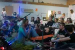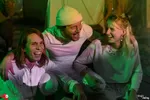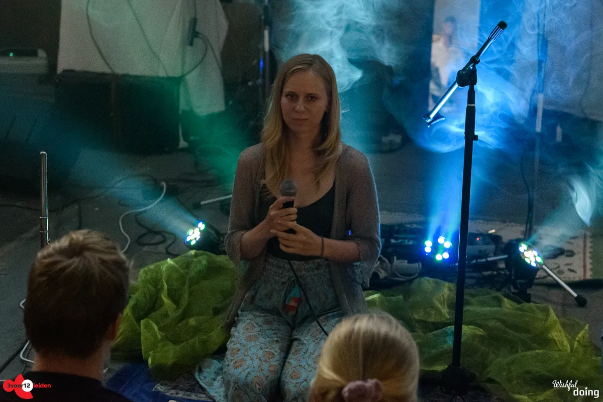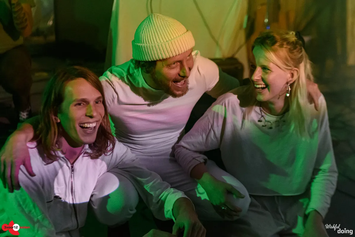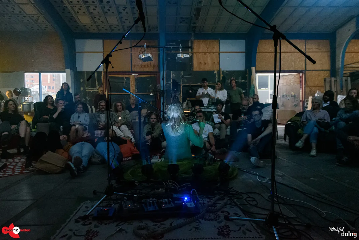 Op een herfstachtige vrijdagavond worden we uitgenodigd in een grote hal van een rauw industrieel-hip complex. Het doet Oost-Berlijns aan en straalt kracht en creativiteit uit. We geven het wachtwoord en komen via de Melkwegstraat direct in het universum van inneruu: er hangt mist uit de rookmachine en er ligt een groot tapijt waarop microfoons en allerlei mengpanelen staan. De gasten loungen op banken of liggen op kussens, met de ogen dicht starend naar een andere wereld. De consumpties zijn genoemd naar songs van het album: de ‘WEEHOO’-cocktail en ‘Overloaded’-pindasoep. Na het zien van een intieme try-out in februari voor pakweg vijftien aanwezigen is het de vraag of het universum van inneruu ook overeind blijft in een zaal met minstens honderd toeschouwers. En inderdaad, ook nu weet inneruu iedereen mee te nemen in hun ‘eigen wereld’. Dat doet de band door een zintuiglijke ervaring te bieden, waarbij publieksparticipatie belangrijk is. Anders dan bij de try-out vraagt inneruu nu minder actie van het publiek. Destijds ging er een piepschuim bal rond in het publiek, maar wie weet is dat minder praktisch in zo’n grote zaal, of had het niet het gewenste effect. Door de zintuiglijkheid en uniciteit van hun optredens is omschrijven lastig; als je ook maar enigszins nieuwsgierig geworden bent, kom dan naar hun optreden en beleef het mee. (Dat kan op 30 september 2022 bij een hernieuwde release party; zie het einde van dit artikel voor meer informatie).