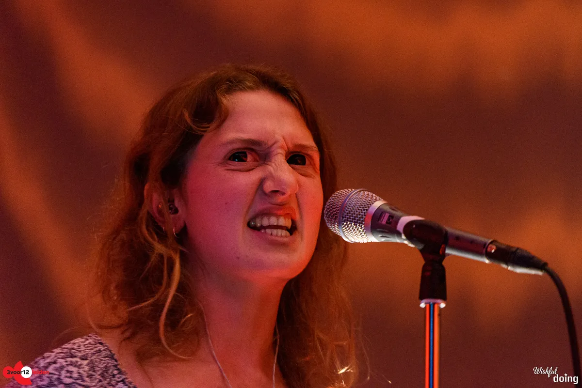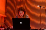 Het eerste dat we zien zijn Mathilde’s lenzen waardoor ze enorme, zwarte pupillen heeft. Het vervreemdende effect doet denken aan een insect of dit videoclip-personage. De elektronische producent staat achter een tafel vol mengpanelen, een laptop en terzijde een microfoon. De ruimte heeft ook wat huiselijks; er ligt een bruin Perzisch kleed en er staat een plantje op de hoek van de draaitafel. Het contrast met de koele beats is treffend. Mathilde loopt regelmatig naar de microfoon, soms beweegt haar linkerhand sierlijk mee met de muziek, soms staat ze met haar handen op haar rug als een onschuldig schoolmeisje, maar ze staat er juist stoer en getatoeëerd. Tijdens het draaien swingt ze mee met de muziek. Ze glimlacht dankbaar bij elk applaus, maar is daartussen ernstig, want gefocust. Haar glimlach is begrijpelijk, want het publiek maakt deels vogelgeluiden als applaus: “Rrrrraaawwwwie!”. Mathilde is eigenlijk grieperig, maar daar is tijdens haar optreden niets van te merken qua energie of performance, knap.