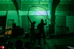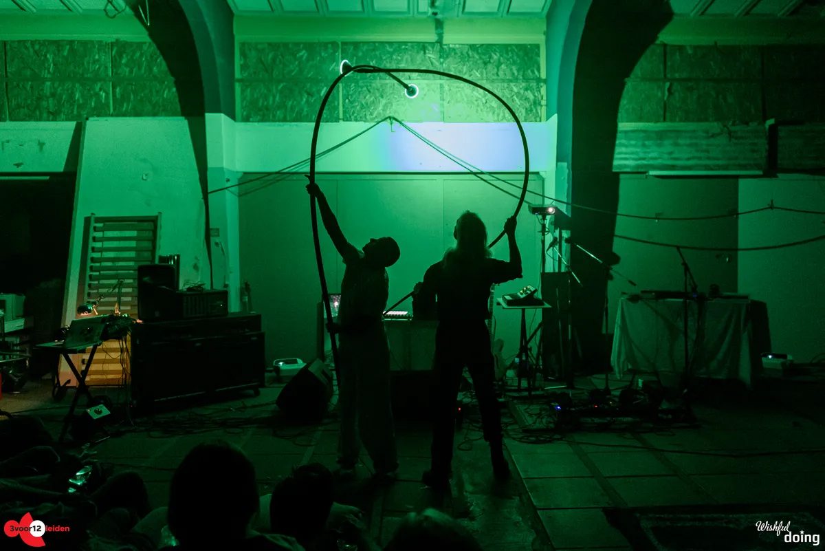 Het is echter nog niet het einde van de avond. Maarten Keus sluit af met een thuiswedstrijd, want deze loods is zijn werkplaats. Deze kunstenaar is er vanavond met twee groene lampen aan buigzame stelen die minstens vijf meter lang zijn. Deze rondzwevende lantaarnwezens heten de Wiggly Wobblies en worden vastgehouden door een begeleider. Op de achtergrond klinken resonerende geluiden: elektronisch gemurmel, en wie erop let, hoort bliepjes als van bits en bytes. In een kwartier komen deze wezens tot elkaar, proberen elkaar soms te overtroeven (wie is het grootst?), schudden heen en weer en knallen soms tegen elkaar in schijnbare strijd. Soms zijn de lampen net voelsprieten, soms als twee verkennende ogen. Uiteindelijk bewegen ze synchroon en gaan gebroederlijk samen af, een verdere verkenningstocht van inneruu tegemoet.