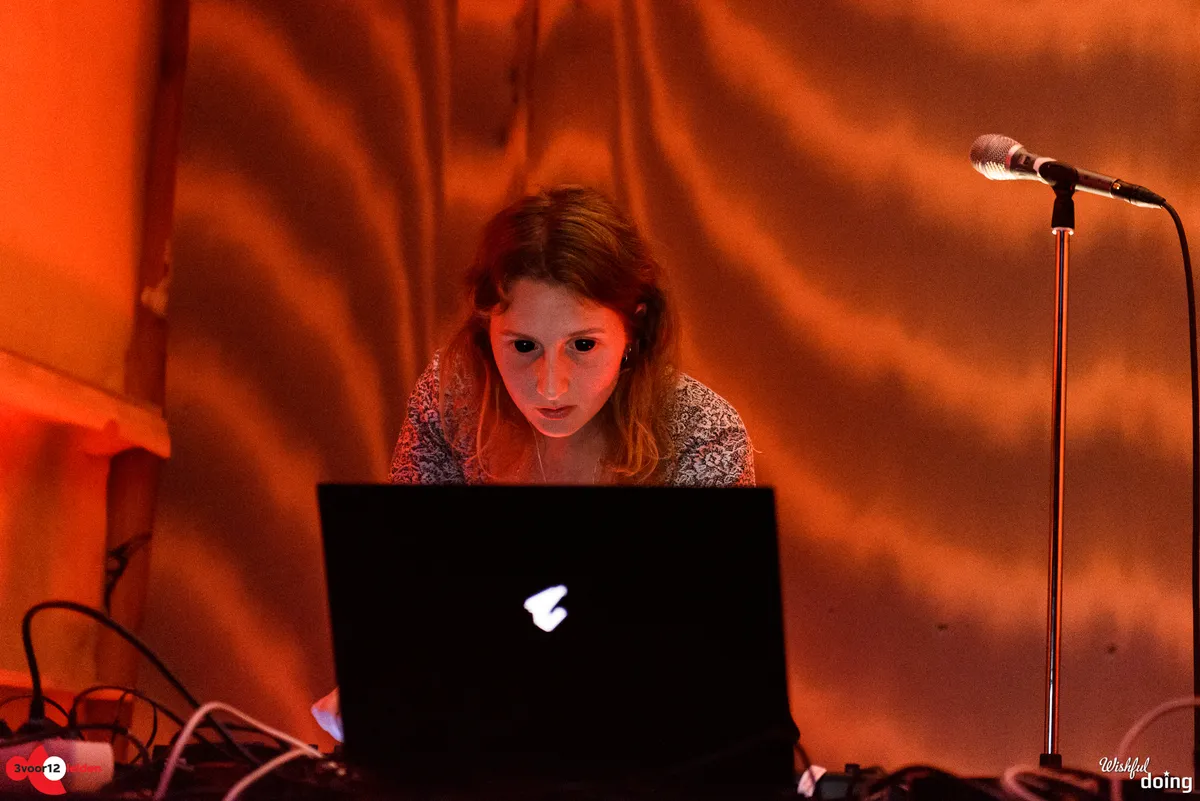 De sfeer die zij daarmee schept als die van een boos sprookje: dreigende beats en wanhopige klanken maken duidelijk dat haar hoek van inneruu geen Eden is, al zitten er ook harmonieus-melancholische nummers tussen die klinken als elfenzang uit The Lord of the Rings. Nummers duren een minuut of tien en bieden steeds wisselende effecten. De visuele elementen ondersteunen de sprookjessfeer: een bellenblaasmachine vult de ruimte met veelkleurige doorzichtige bellen als in een kinderdroom en de rookmachine verspreidt een aangename mist. Het publiek luistert ademloos, wat pas opvalt als er aan het eind iemand hoest.