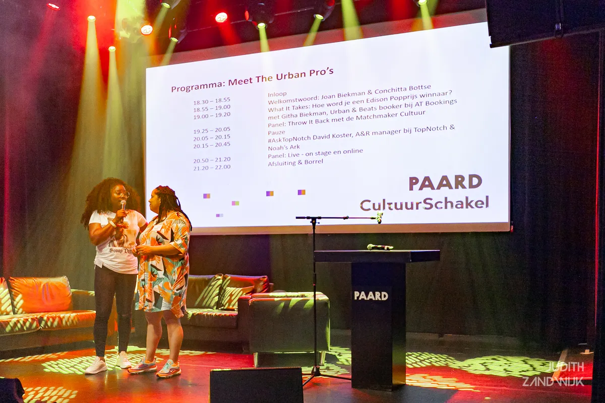 Een platform waar jonge artiesten in het urban-genre advies krijgen voor alles waar ze tegenaan lopen van mensen die hun sporen lang en breed verdiend hebben. Op papier een vanzelfsprekend concept, maar niet minder noodzakelijk vonden Joan Biekman van Cultuurschakel en Conchitta Bottse van onder ander PAARD richtten Meet The Urban Pro's op. Bij de vorige Haagse Popprijzen won het platform de prijs voor het beste initiatief. Op vrijdag 12 maart staat de volgende editie met als thema rechten in de muziek op het programma. Voor ons een reden om de initiatiefnemers te vragen waar Meet The Urban Pro's nou precies om draait.