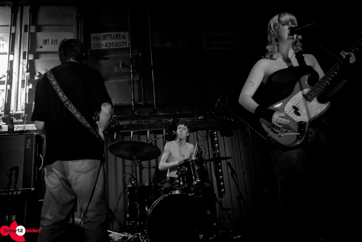 Dit Frans-Nederlandse trio (de Canadees ontbreekt) maakt melancholisch aandoende post-punk met elementen van new wave en shoegaze. Hun muziek brengt je in het soort dromerige stemming die je kunt hebben als je vanaf Scheveningen uitkijkt over de staalgrijze zee onder een grauwe lucht. Ook buiten hun genre gedacht, passen ze helemaal bij Live in de Loods: containers worden vaak over zee vervoerd en een loods leidt je daar. Ongemerkt verglijdt het ene nummer in het andere, voortgedreven door de drum van Ruben Kramer. “Please wear ear protection, our drummer can get really fucking loud!” waarschuwt Sea Foam Grey. Je kunt diens instrument inderdaad niet missen, al is de intensiteit gelukkig ook weer niet van het niveau TankZilla of DŸSE - dan zouden bas, zang en gitaar al helemaal overstemd worden.