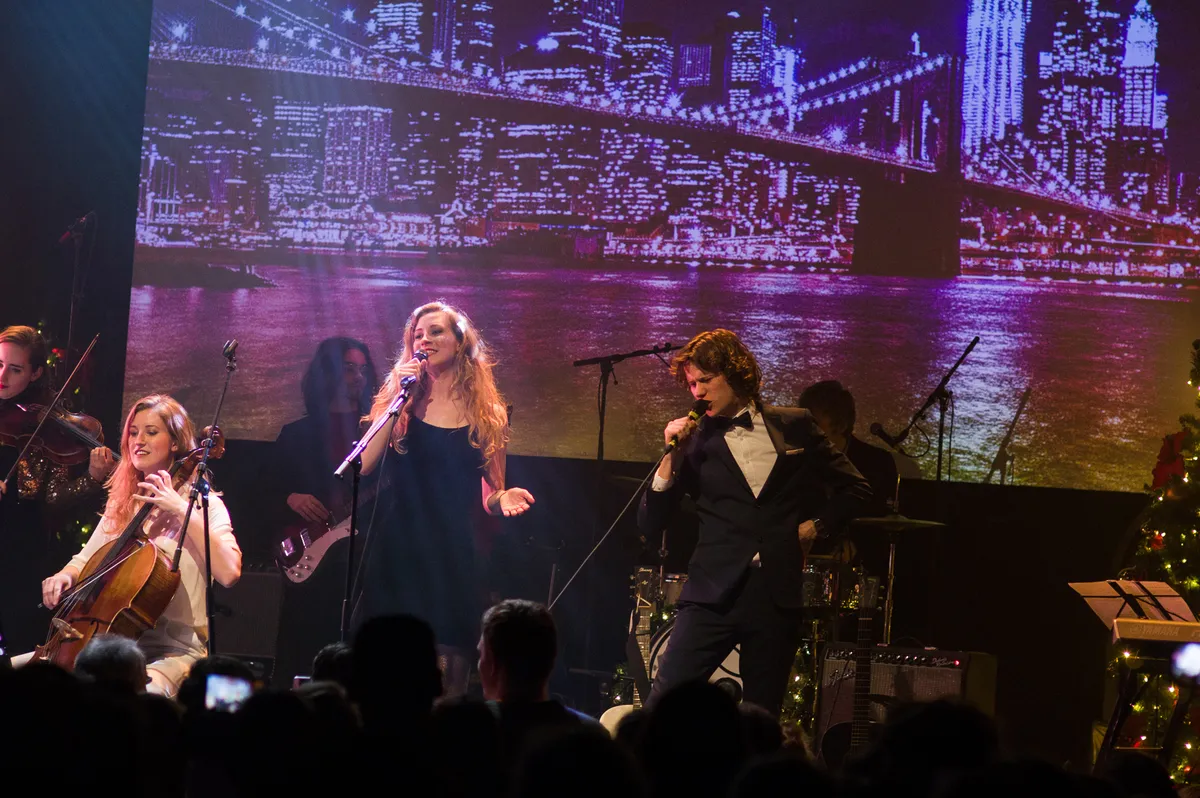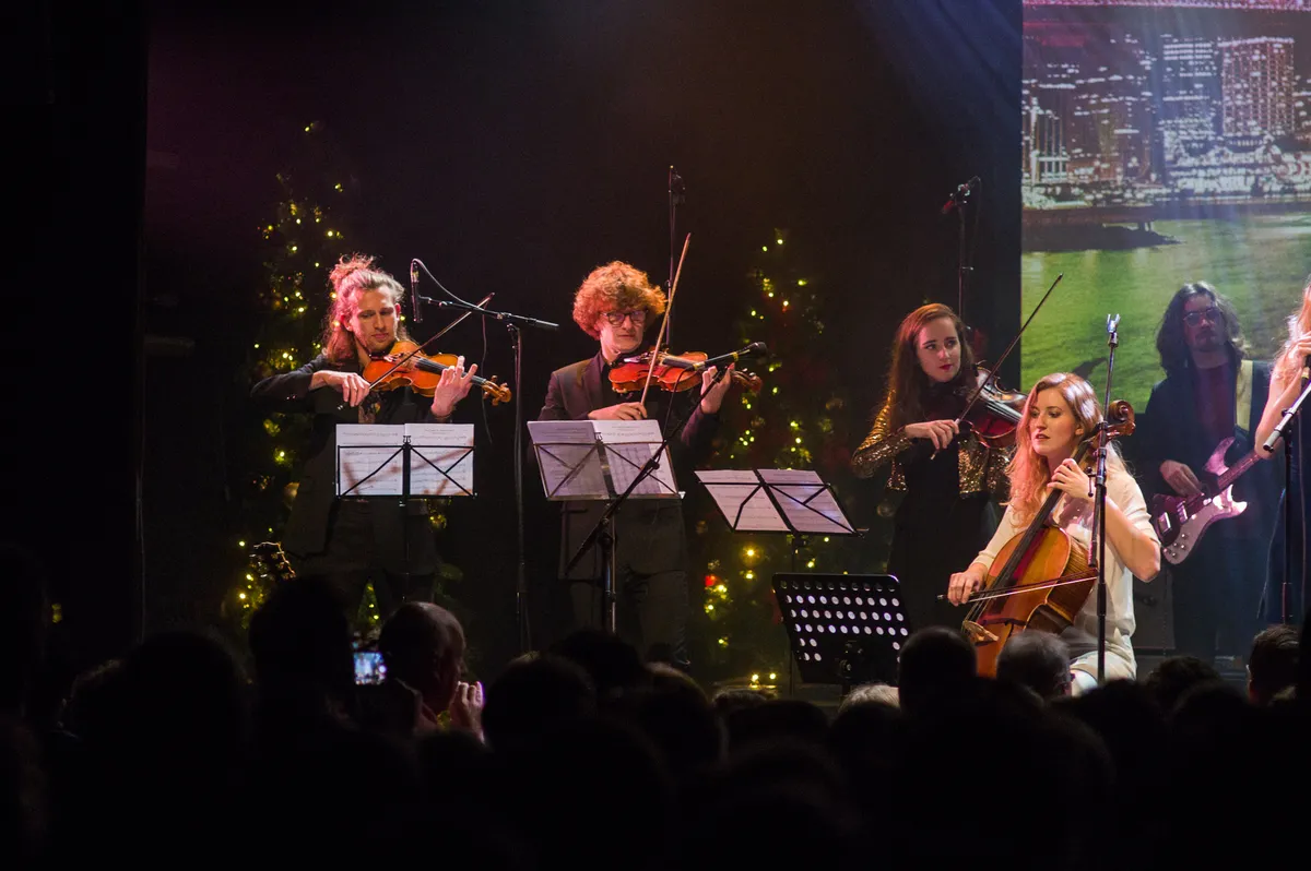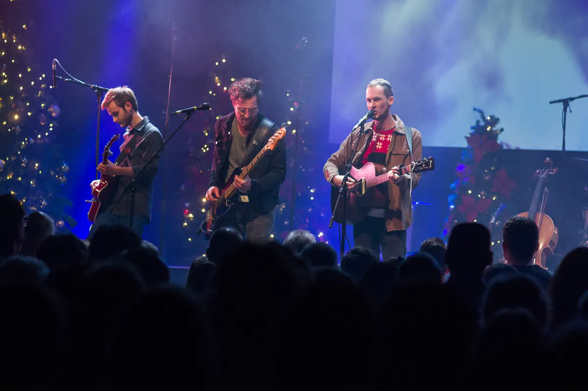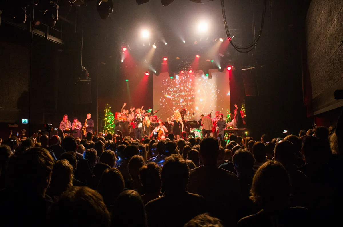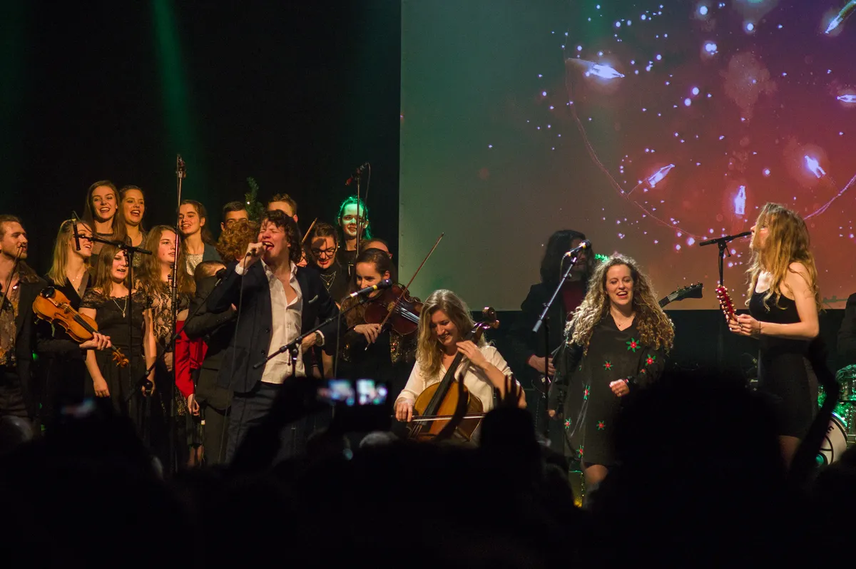Kerstclichés, zeker, maar niet zonder een knipoog. Wanneer al vroeg in de set bij een speciale Nederlandse vertaling van ‘Let It Snow’ het mechanisme boven het podium niet helemaal meewerkt en er slechts wat pluizige sneeuw neerdwarrelt, zorgt dat voor hilariteit op zowel het podium als in de zaal. Het is dezelfde ironie die ook het oeuvre van de groep kenmerkt en door het publiek meteen goed wordt opgepakt. Het zet de toon voor de rest van de avond.