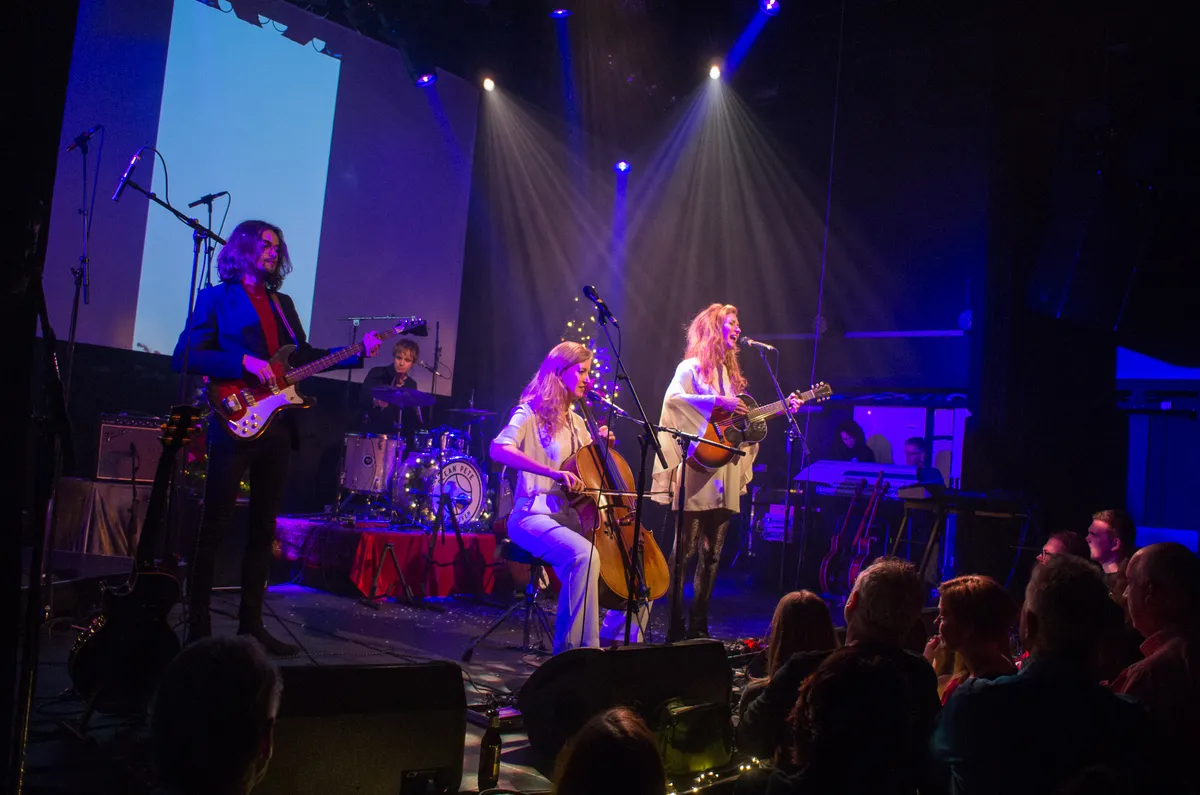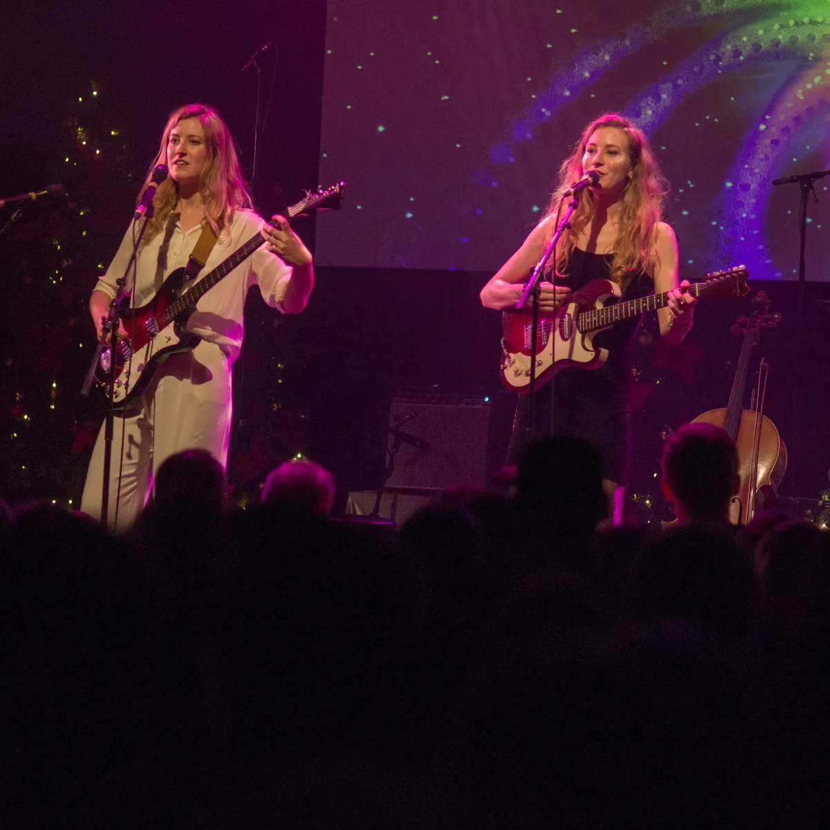 De band heeft de afgelopen jaren een oeuvre opgebouwd dat een pad bewandelt tussen akoestisch en energieke garagerock met vaak licht-humoristische teksten. Vanaf de opener ‘Donkere Nacht’, een eigen vertaling van ‘Oh Holy Night’, compleet met koor in de zaal, laten de zussen direct al merken dat er vanavond ook muzikaal geen enkel kerstcliché wordt geschuwd. “Als je niet van kerst houdt, wordt het heel zwaar,” waarschuwt de in hemels wit geklede zangeres-gitarist Loes Wijnhoven het publiek al aan het begin van de avond.