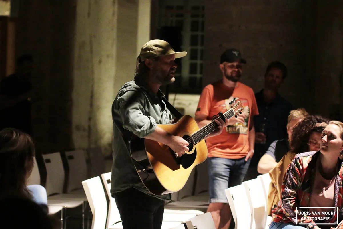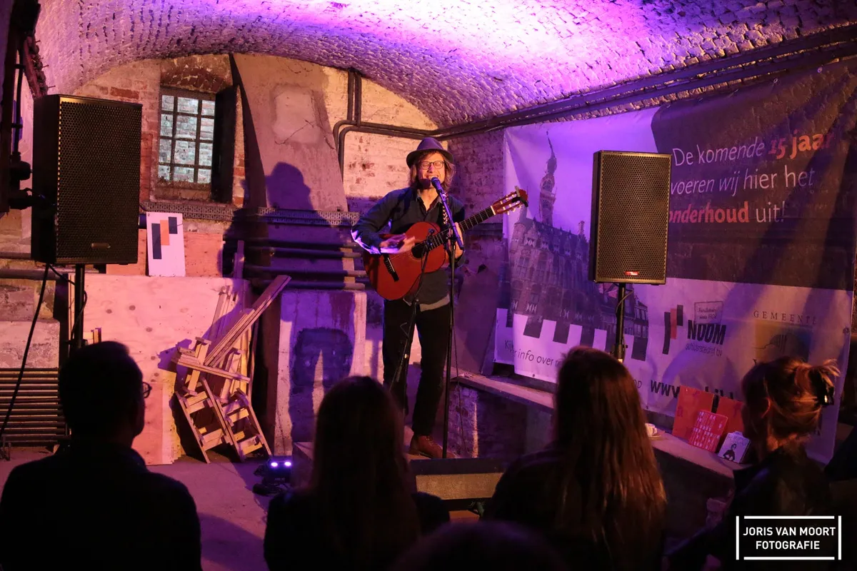 Even verderop bij het oude stadhuis kunnen bezoekers kiezen uit twee acts. In de rechtbank van het stadhuis staat Aafke Romeijn en in de kelder staat FULCO. Bij laatstgenoemde duiken we de kelder in en zien we FULCO (Fulco Ottervanger). Hij speelt hier solo een set en laat de bezoekers weten dat hij vroeger vaak in Veere was te vinden. In 2020 speelde hij nog in Gebouw-T, Bergen op Zoom. Kleine liedjes, begeleidt hij met gitaar zijn songs. Zachtjes zingt men mee met ‘Grensdorp’ en hij vertelt en zingt graag hoe hij het leven ziet, terwijl de rest van het publiek muisstil is en luistert. Later die avond speelt hij nog een tweede set.