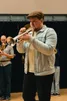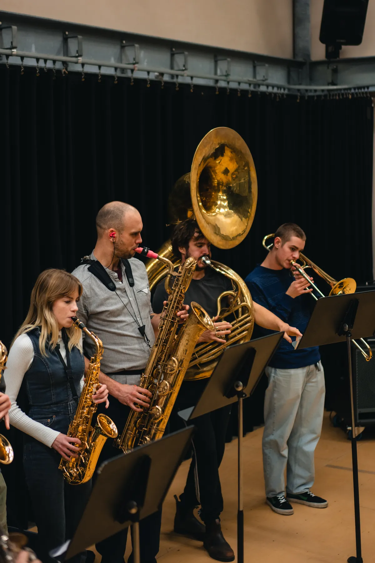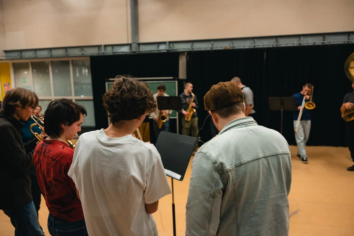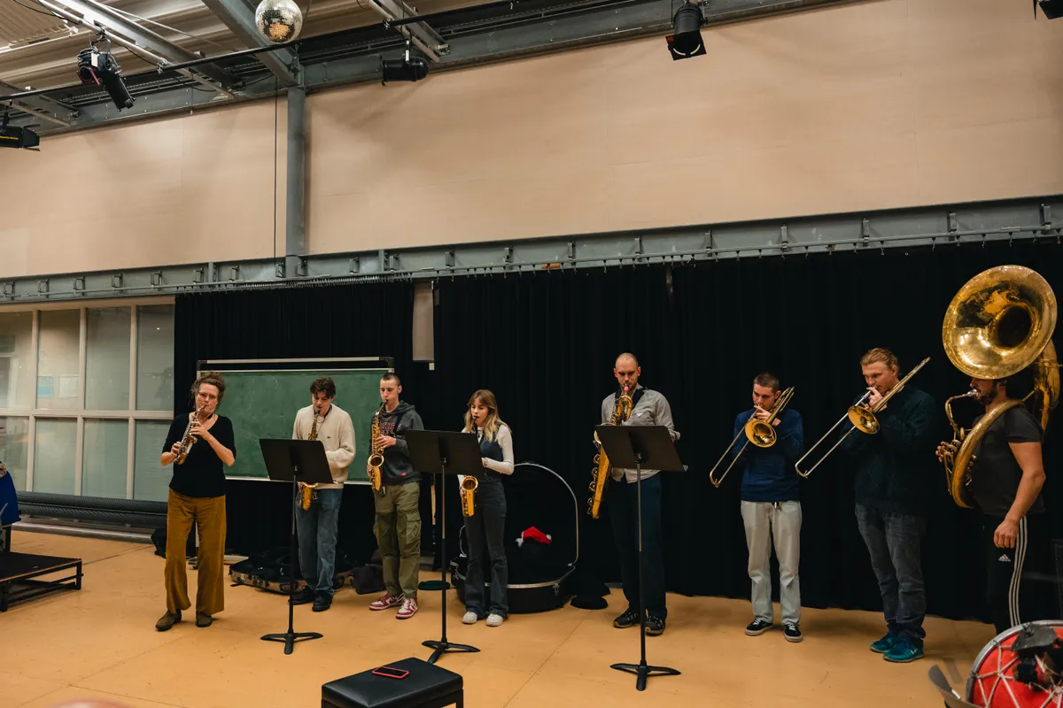 Gedurende de les sluiten er nog een paar nieuwe leerlingen aan. Ze zijn er voor het eerst, maar kunnen zich rustig mengen in de inmiddels groter worden groep met blazers. Er zijn verschillende soorten saxofoons, trompetten, trombones en sousafoons. Die worden ondersteund door meerdere trommelaars.