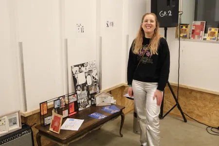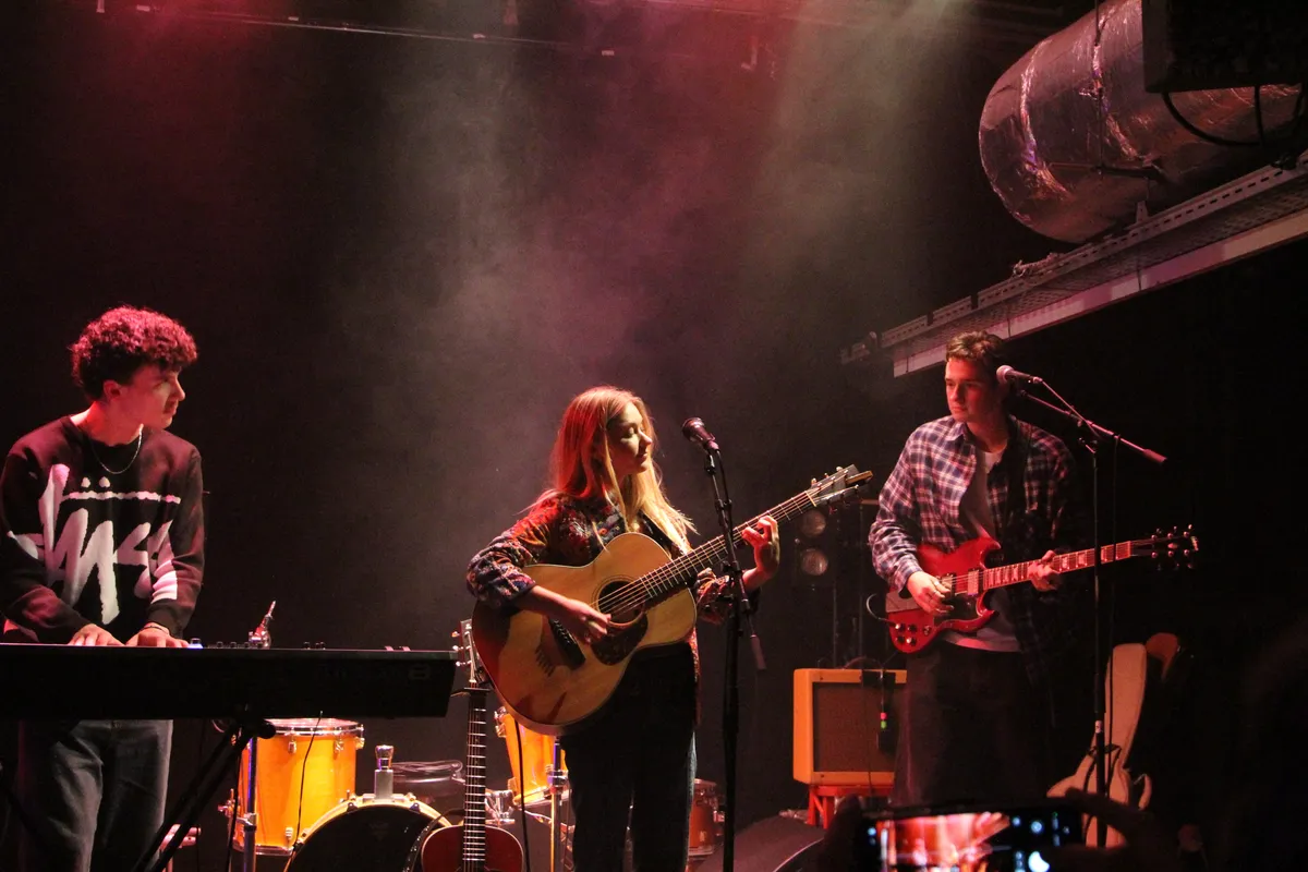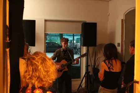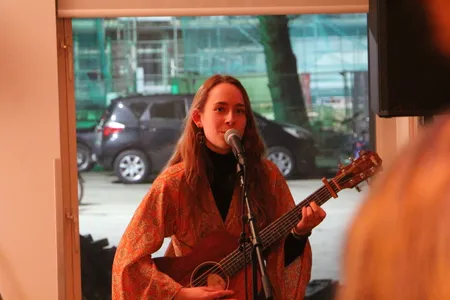 Drie studenten aan Conservatorium Haarlem staan aan het roer voor deze avond en dat zijn Maud Grimberg, Nienke Schuitemaker en Annelie Spierings. Alle drie ook muzikanten en songwriters. Het is volgens het drietal ook niet iets eenmaligs, maar het moet wel uitgroeien tot iets blijvends. Slachthuis Haarlem is min of meer een festival plek waar op verschillende plaatsen iets is te zien en te horen, zoals workshops, maar ook live muziek. Als de drie zich melden op het podium, vertellen ze wat achter het initiatief zit. ,,Het gaat om verbinding en we willen een community bouwen”, zegt het drietal . Het woord multidisciplinair is echt wel van toepassing, want naast de exposities die verschillende creatieve mensen hebben gemaakt. Met creativiteit is het niet alleen op kunstzinnig vlak bezig zijn, maar ook muzikaal bezig zijn. Tijdens de avond is de volgorde van de optredens niet gedeeld via de socials, omdat de drie vinden dat je voor iedereen moet kunnen komen.