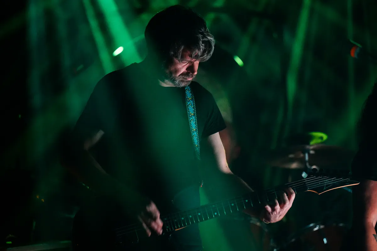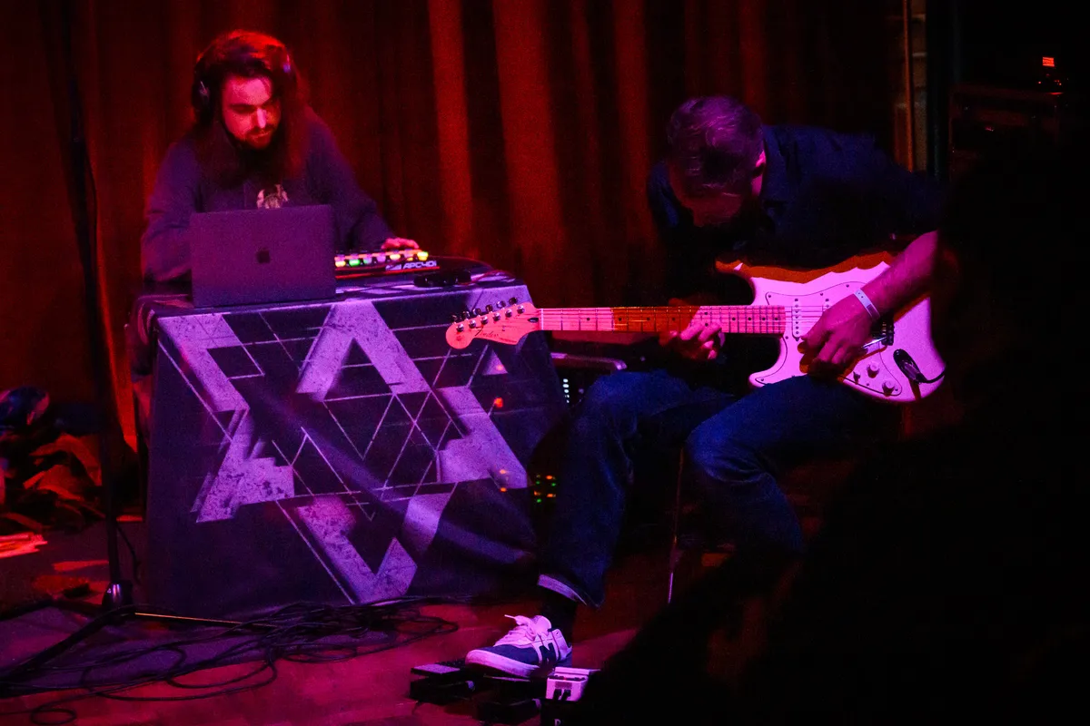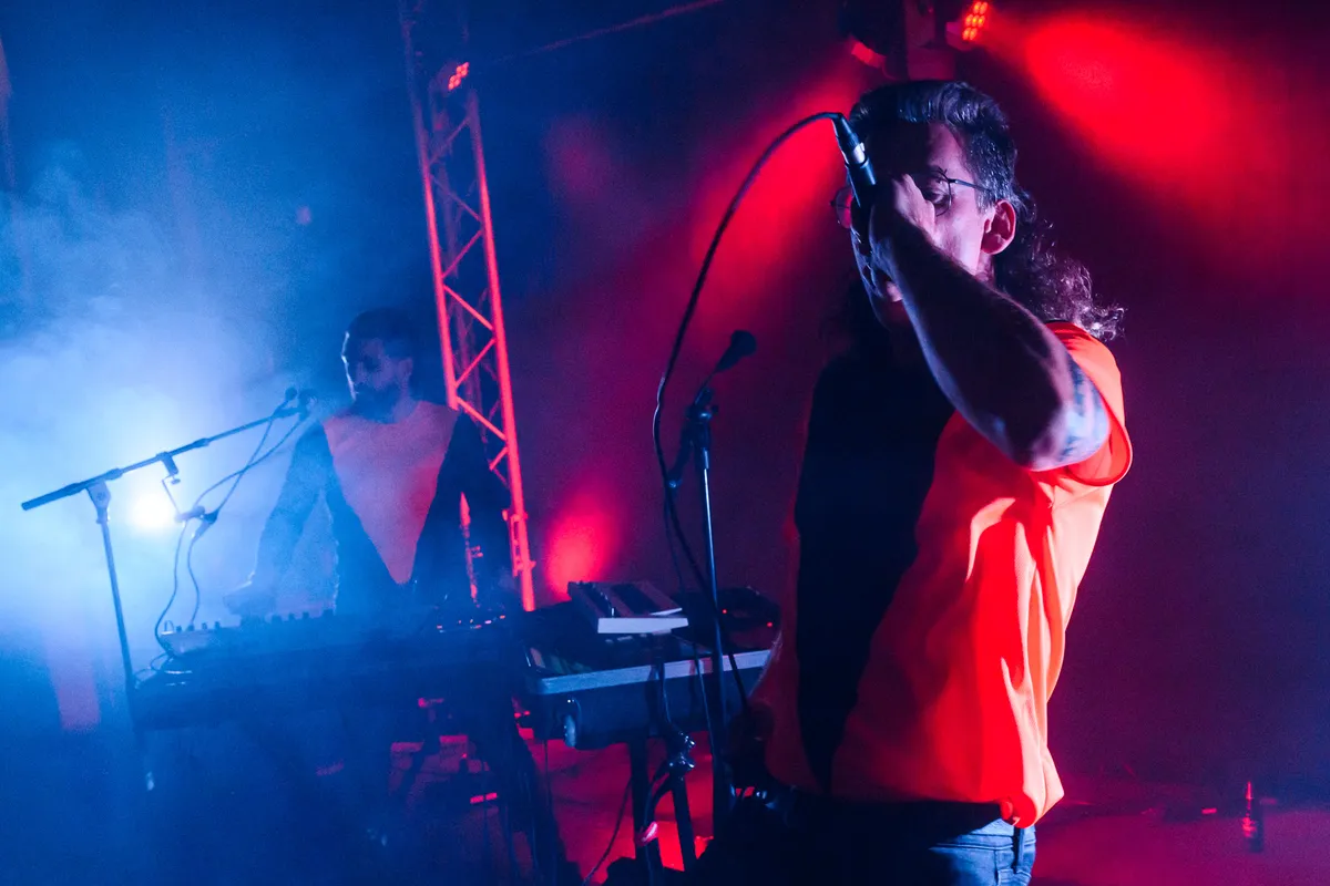 Knielend tegenover elkaar zit het Duitse duo House of Gloom, hun ogen rustend op de grond. Langzaam bewegen ze naar elkaar toe, hun blikken gefixeerd op dezelfde telefoon, terwijl een kakofonie van nieuwsberichten en social mediaposts door de ruimte galmt. Wanneer de herrie eindelijk verstomt, staan ze met een gebogen, bijna verslagen postuur voor het publiek, nog steeds naar de vloer starend. Op dat moment klinken de eerste donkere, dreigende gitaarklanken van Konstantin Richter.