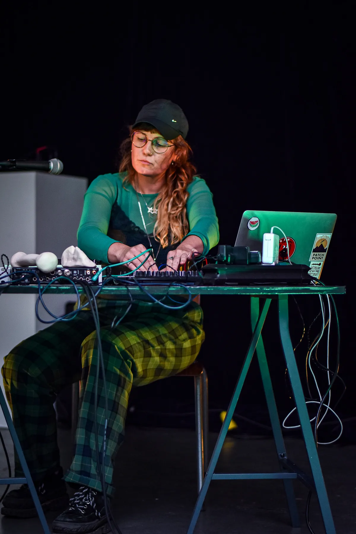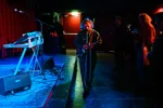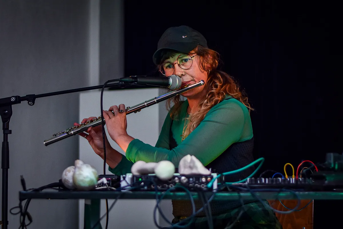Tijdens de wacht tot Mélodie Blaison begint (er zijn wat technische problemen) hebben we mooi even de tijd om te kijken wat er allemaal op de tafel voor haar ligt. En dat zijn naast een collectie synthesizers en samplers ook een aantal vreemde voorwerpen die we zo snel niet thuis kunnen brengen. Naast de dwarsfluit, staan ook deze voorwerpen centraal in Blaisons composities, en komen we er later achter dat het een verzameling aan fluiten en drones blijkt te zijn met wel heel bijzondere geluiden.
