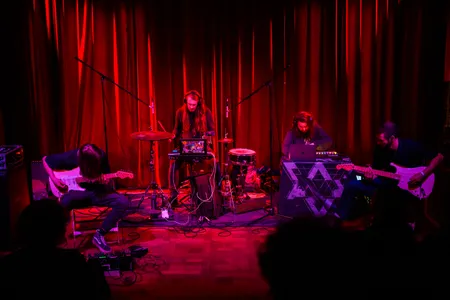 Al snel ontvouwen zich meerdere lagen van drums, zang en toetsen, en het Zwitserse trio vult de zaal met hun omvangrijke opstelling: synthesizers, een elektroharp, meerdere drums, gitaar, en zelfs vocalen die als instrumenten worden gebruikt. De diversiteit aan genres die ze doorlopen – van pop en punk tot rock, indie, en zelfs instrumentale jungle en techno – laat zien dat Omni Selassi zich aan geen enkele stijl vastklampt. Wie slechts dertig seconden van hun optreden meepikt, merkt onmiddellijk hun muzikale veelzijdigheid. Het is bijna verbijsterend hoeveel er tegelijkertijd op het podium gebeurt. Dat de leden van Omni Selassi extreem muzikaal zijn wordt bevestigd door de drummer/electroharpspeler, die dit allemaal op blote voeten doet. (FC)