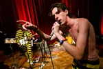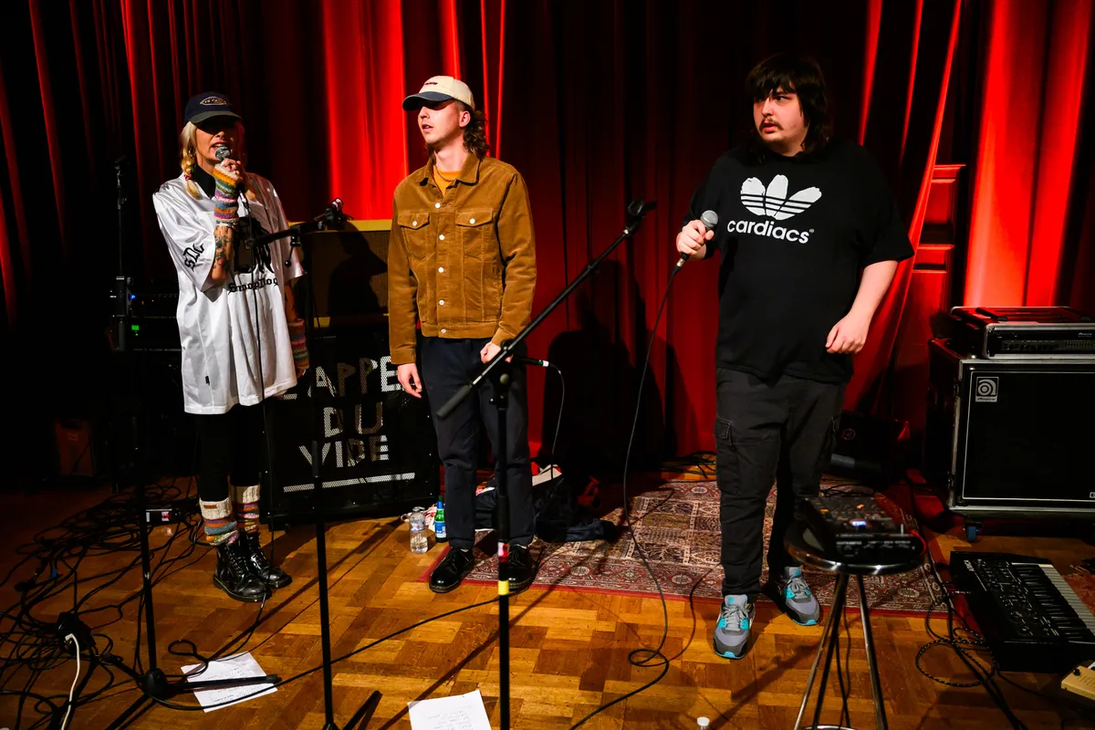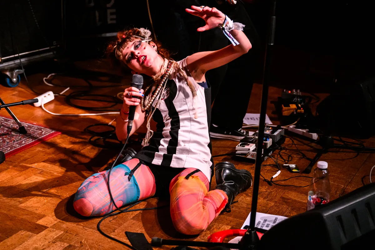 Na een zaterdag dag vol uitersten, van dromerig tot destructief, lijkt de zondag meteen nog dieper in het onvoorspelbare te duiken. In De Nieuwe Vorst wacht Fellatio: drie opvallende figuren in boevenpakjes, een koortsachtige baslijn, en een frontman die meer prediker dan zanger is. Hij krioelt over de grond, beweegt eclectisch, kijkt je recht aan en toch langs je heen, alsof hij van een andere planeet komt. Fellatio’s ‘postpeniskrautpopdiscopunk’ is even absurd als het klinkt, maar het werkt: het publiek danst eerst voorzichtig, daarna uitzinnig, alsof ze meegezogen zijn in een cultceremonie in het krankzinnige universum van slungelige frontman Abel. Fellatio speelt niet met je aandacht, maar eist ’m op, met een zweterige, manische flair die ergens tussen Fat Dog en Warmduscher in zit.