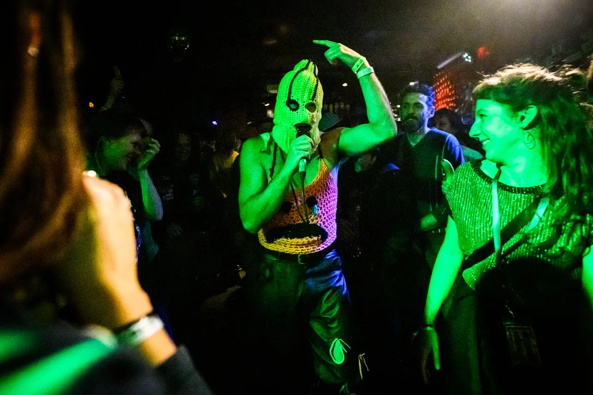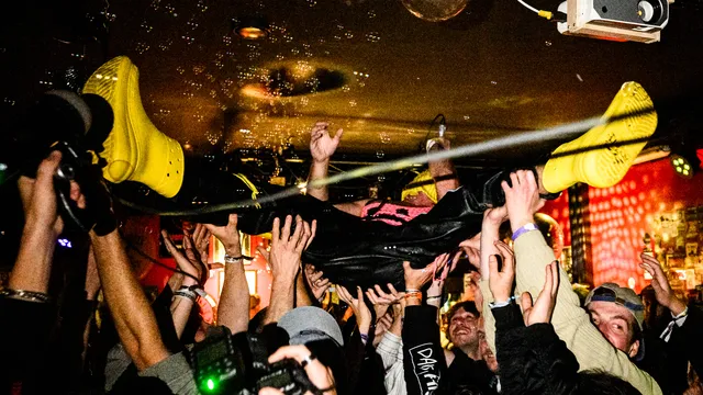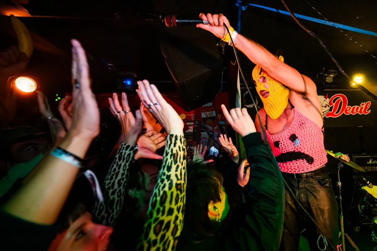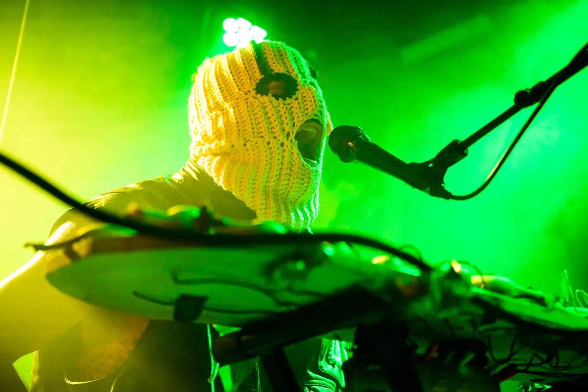 Afsluiten doen we met Sad Banana, en ja, dat is precies zo vreemd als het klinkt. Op het podium: een piano van bananen, drie blenders, een banaan aan het plafond. De Vlaamse artiest komt huilend op met een bananenmasker, loopt zijn snikken tot een beat en schakelt moeiteloos tussen chanson, hiphop en (dance)punk. Tijdens het sensuele ‘Pompelmoesje’ laat hij iemand uit het publiek een banaan pellen; even later vliegen er trossen bananen door de lucht, één vol op iemands hoofd, auw. Dan een stagedive, een crowdsurf tot aan de bar, terug het podium op. Het is absurd, grappig, chaotisch, ofwel: Murf/Murw in een noten.. uh… bananenschil!