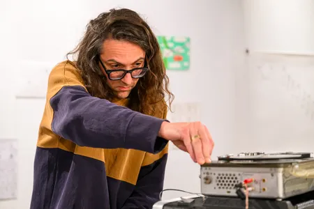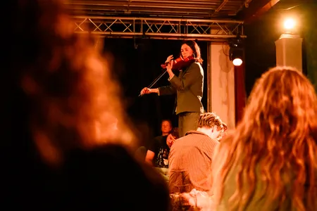 Bovenin de pop-upruimte Duo Volcano (rechts van de FEBO bij Stadhuisplein) ligt de vloer vol kleden en kussens. Te midden staat Roxane Métayer met haar viool als verlengstuk van de natuur. Uit de vier hoekspeakers komen veldopnames die ze eerder dit jaar maakte tijdens een residentie in Japan: krekels, regen, stemmen, een verre storm. Métayer loopt langzaam tussen de mensen door, strijkt een paar lange tonen, en mengt zich met de geluiden alsof ze zelf onderdeel is geworden van dat landschap. Soms wordt het dreigend, alsof er iets in de mist beweegt; dan weer geruststellend, bijna meditatief. Doe je ogen dicht en je waant je in een arthousefilm, een langzame achtervolging door het regenwoud in Okinawa. Métayer laat zien hoe spannend stilte kan zijn, hoe subtiel ze spanning kan opbouwen en hoe spanning en rust hand in hand kunnen gaan.