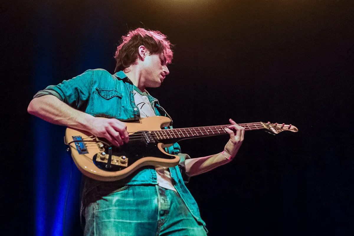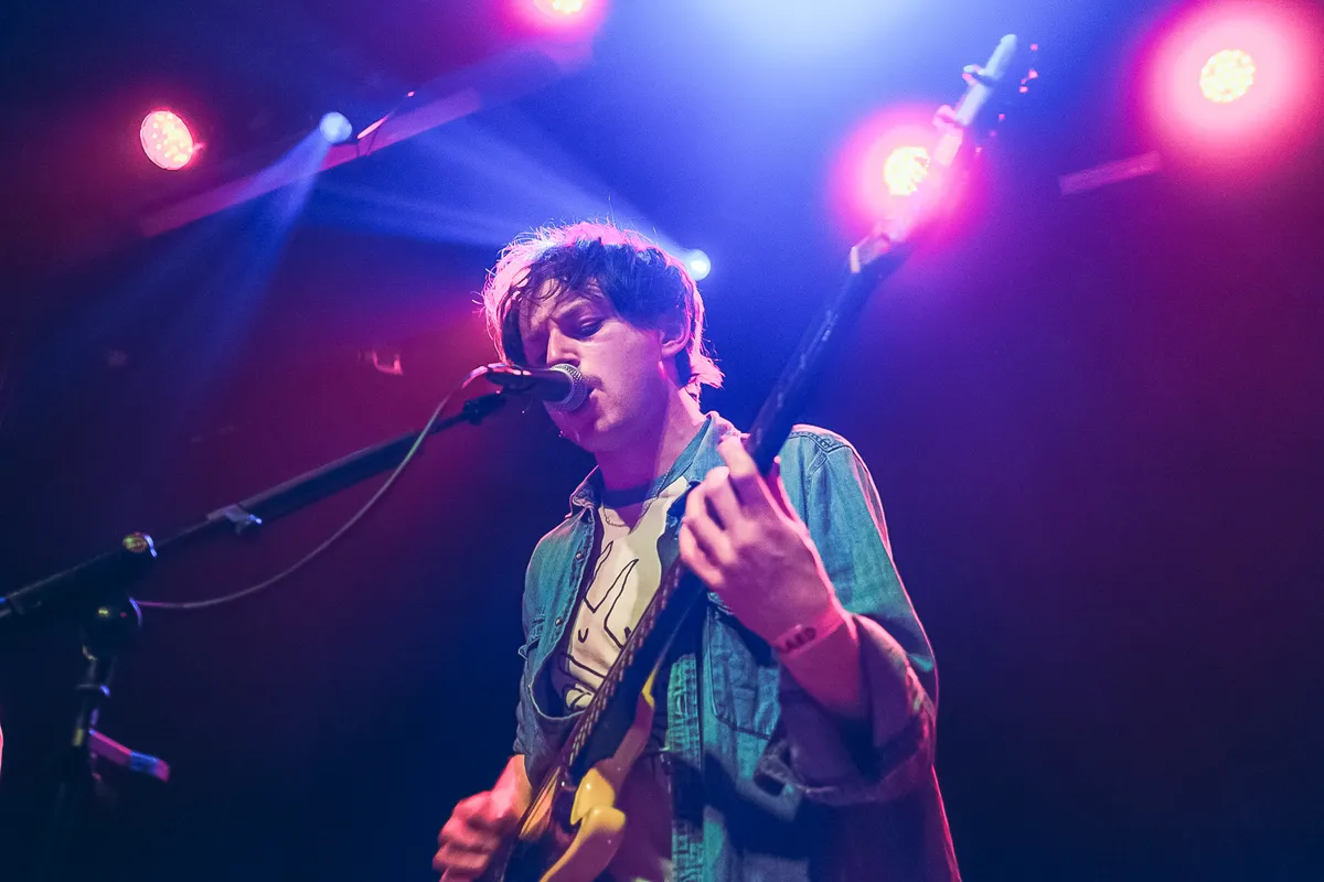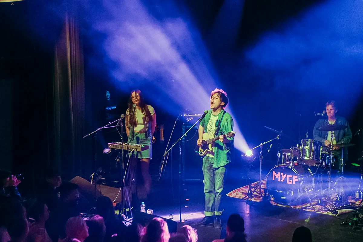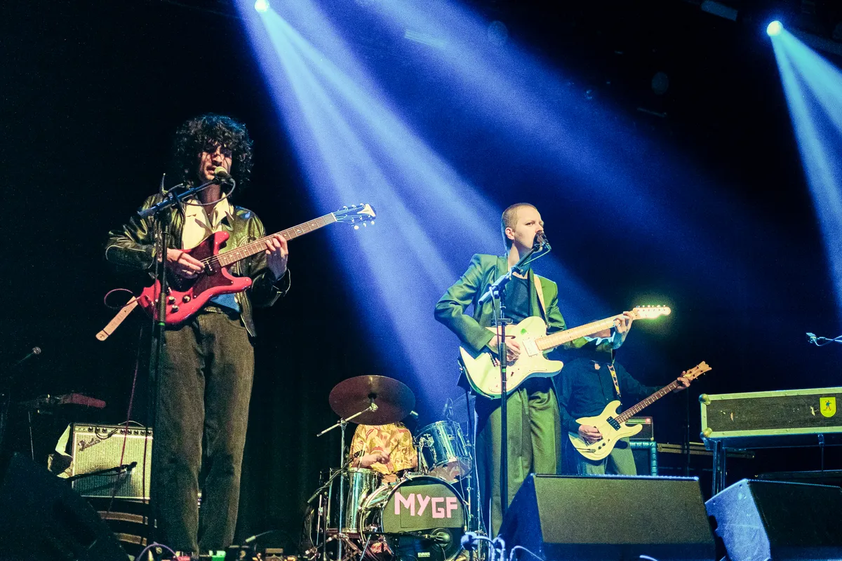Nadat support act Plonki het publiek heeft opgewarmd met shoegazy en catchy indie riffs, is het tijd voor My Girlfriend. Zonder enige aankondiging stappen de bandleden het podium op. Geen gedoe, geen lange introducties—meteen muziek. ‘Party’, de openingstrack van de nieuwe EP, bouwt op met pulserende synthesizers en zet de toon voor de avond. Vanaf de eerste noten valt alles op z’n plek: de band klinkt strak en zelfverzekerd. Direct daarna springt het vijftal naar het tweede nummer op de EP: ‘Are We Out of the Woods?’ Het nummer bouwt verder op de energie van de opener, maar met een extra opzwepende dynamiek waardoor het onmogelijk is voor het publiek om stil te blijven staan.